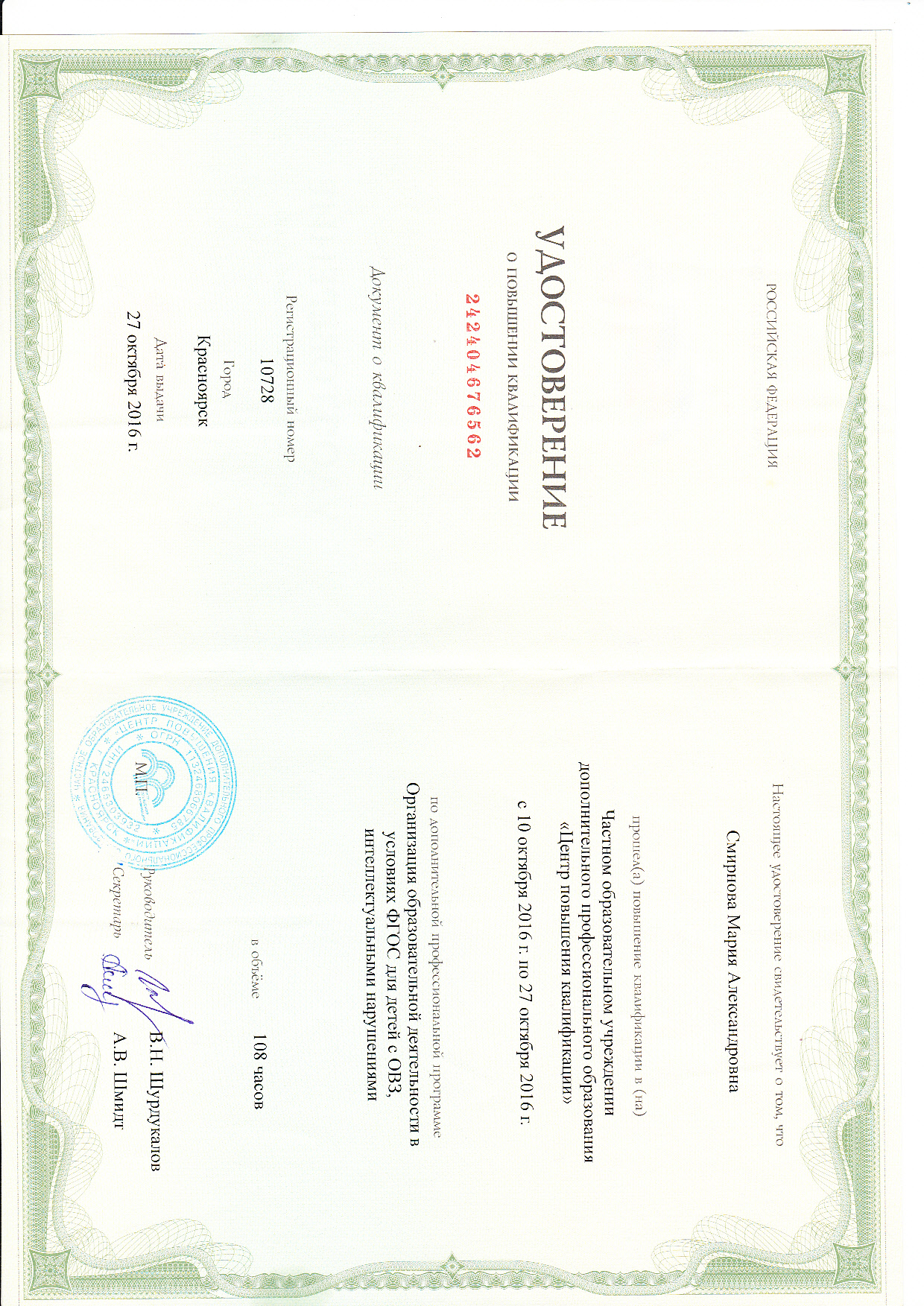 Обучение по курсу: Организация образовательной деятельности в условиях ФГОС для детей с ОВЗ, интелектуальными нарушениями. Документ о повышении квалификации: скачать