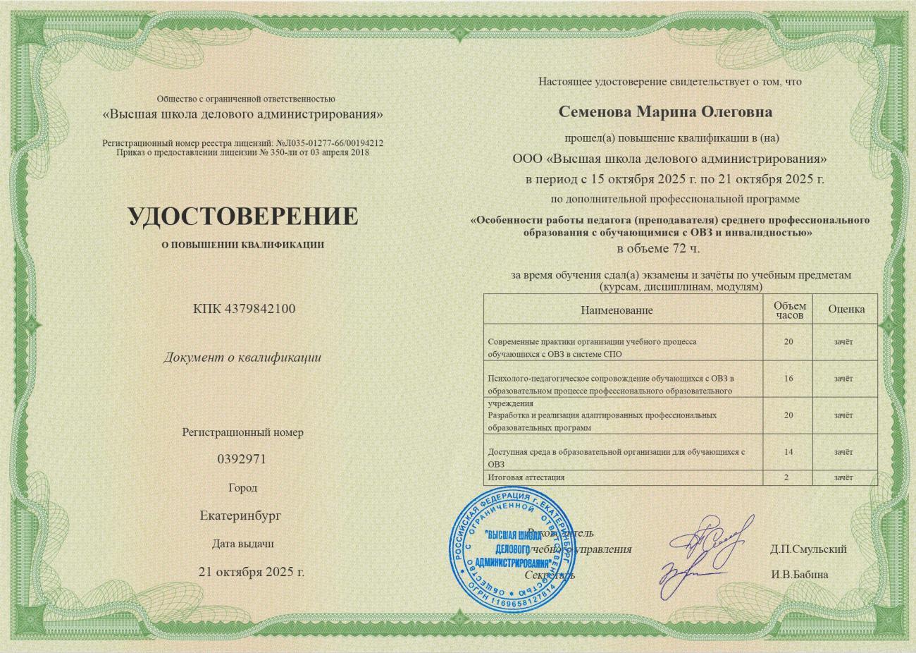 Обучение по курсу: «Особенности работы педагога (преподавателя) среднего профессионального образования с обучающимися с ОВЗ и инвалидностью». Документ о повышении квалификации: скачать