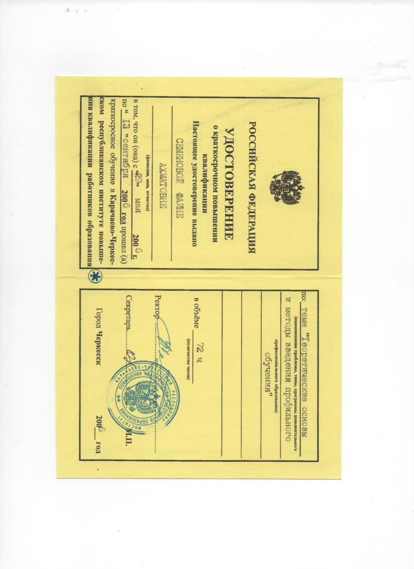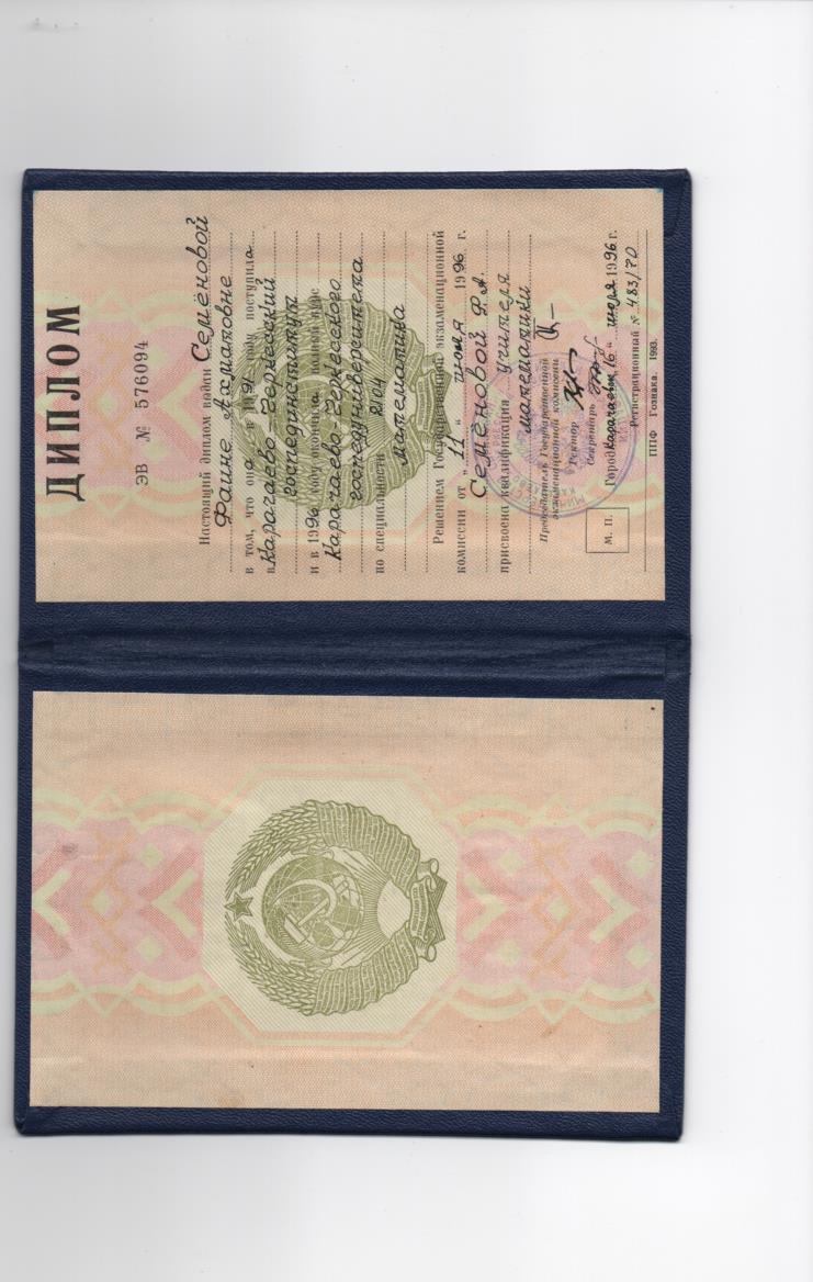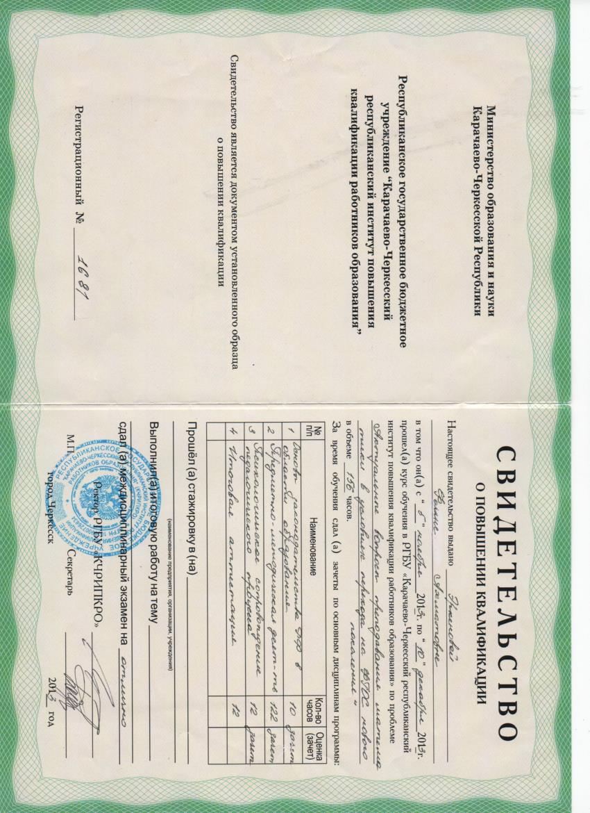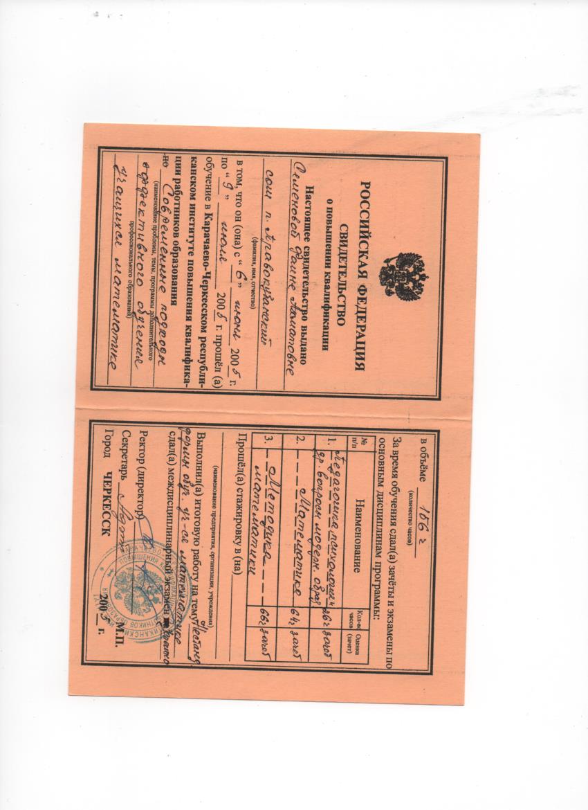 Образование по специальности: 2104, математика. Присвоена квалификация: учитель математики. Документ о получении образования: скачать