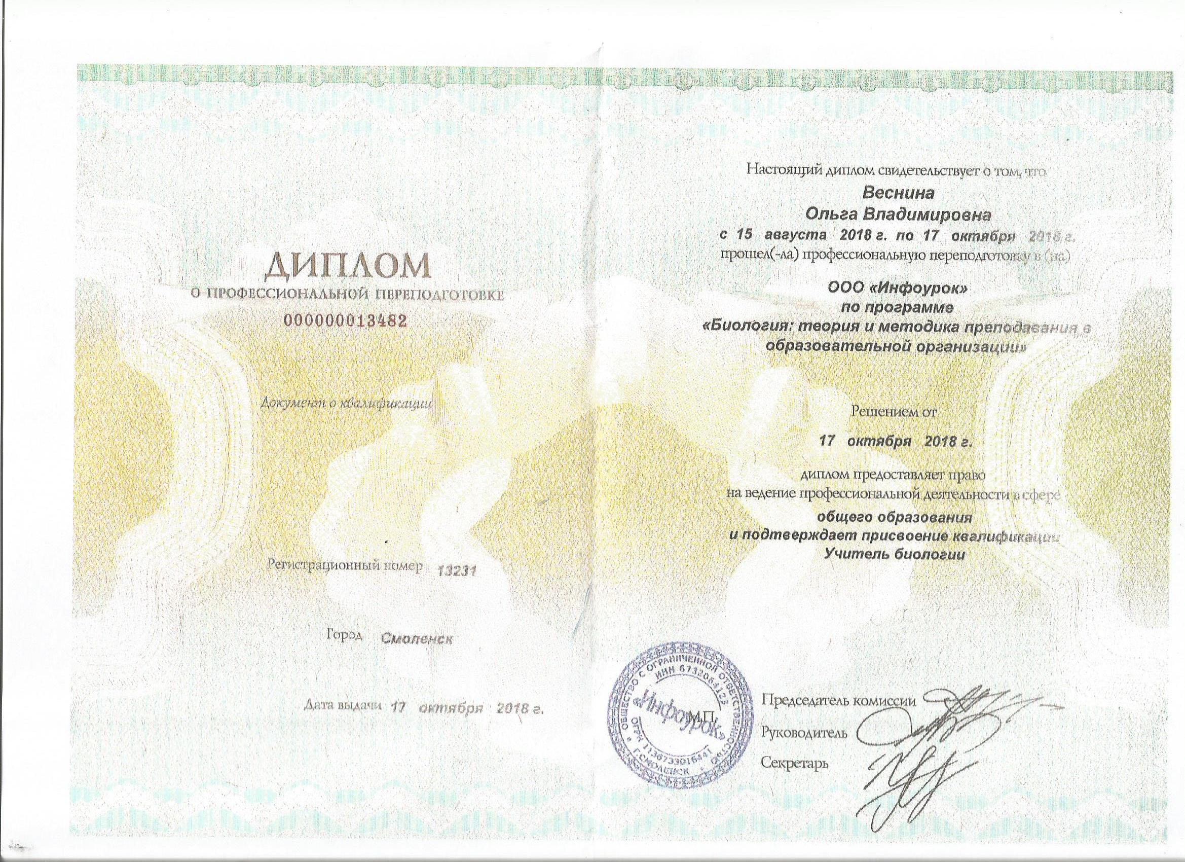 Образование по специальности: учитель. Присвоена квалификация: биология. Документ о получении образования: скачать