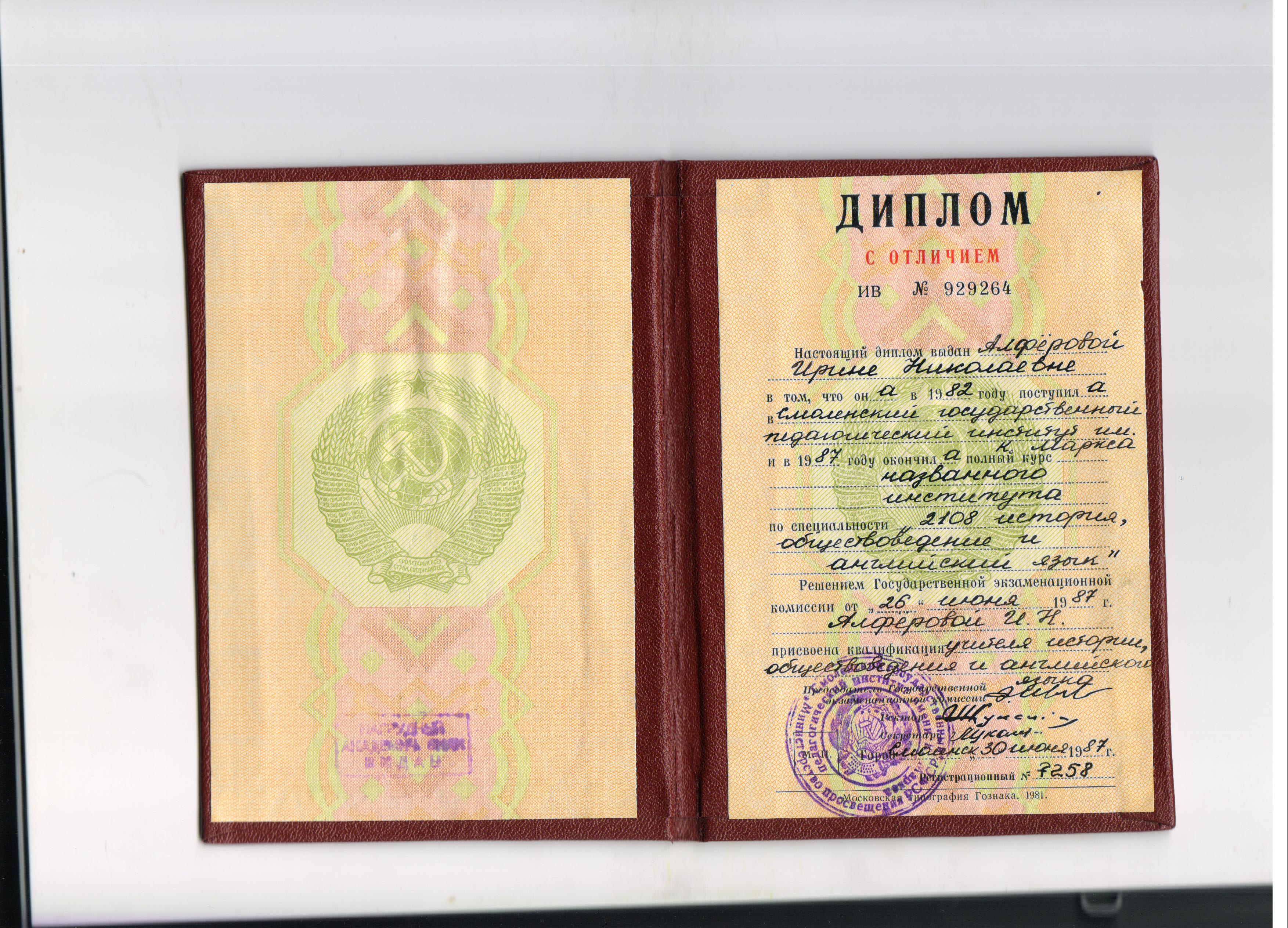 Присвоена квалификация: учитель истории, обществознания и английского языка.