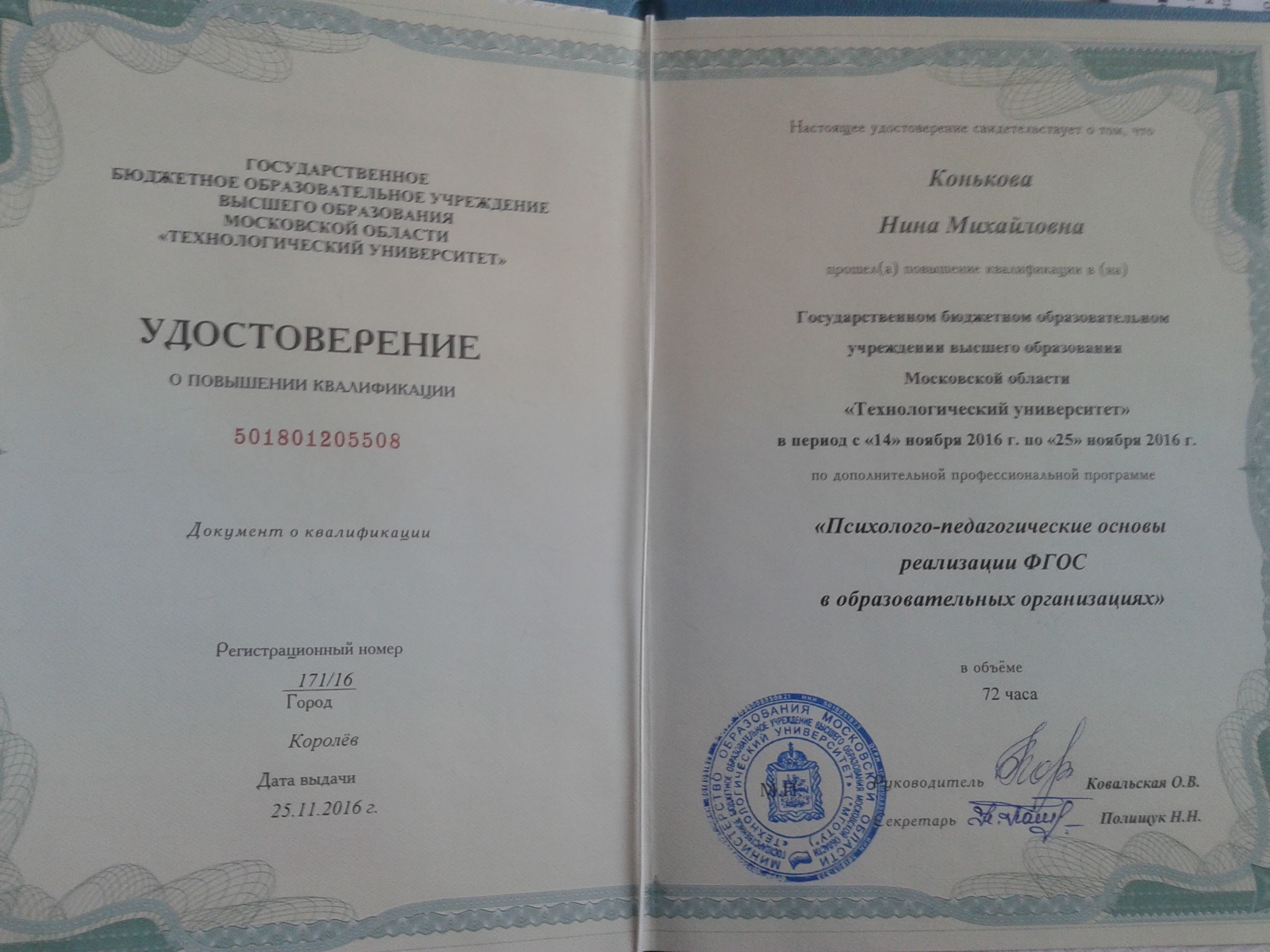 Обучение по курсу: Психолого-педагогические основы реализации ФГОС в образовательных организациях. Документ о повышении квалификации: скачать