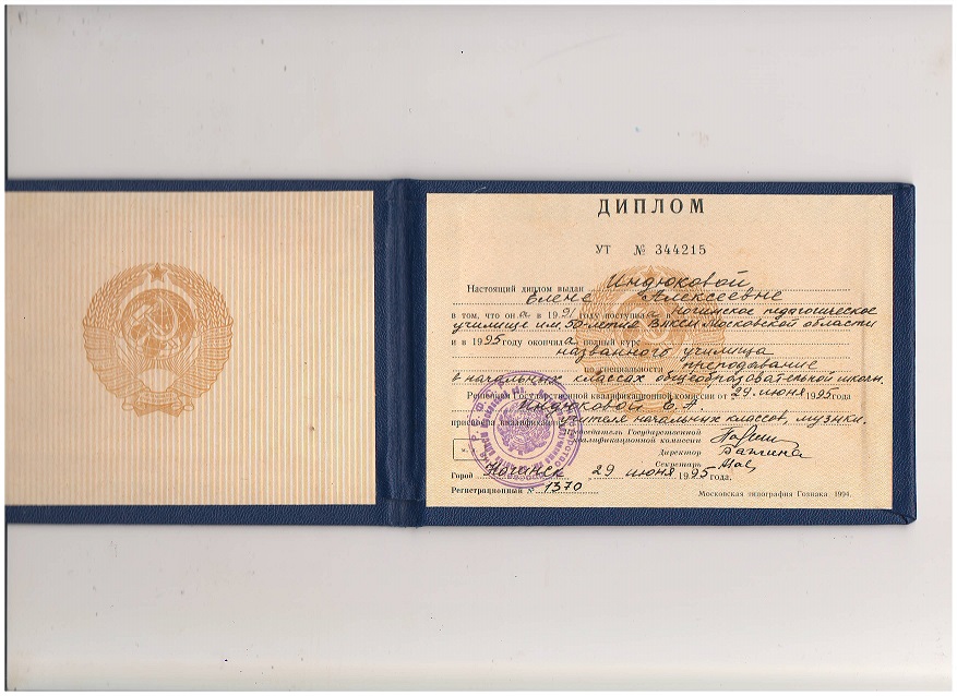 Образование по специальности: Преподавание в начальных классах общеобразовательной школы. Присвоена квалификация: Учитель начальных классов , музыки. Документ о получении образования: скачать