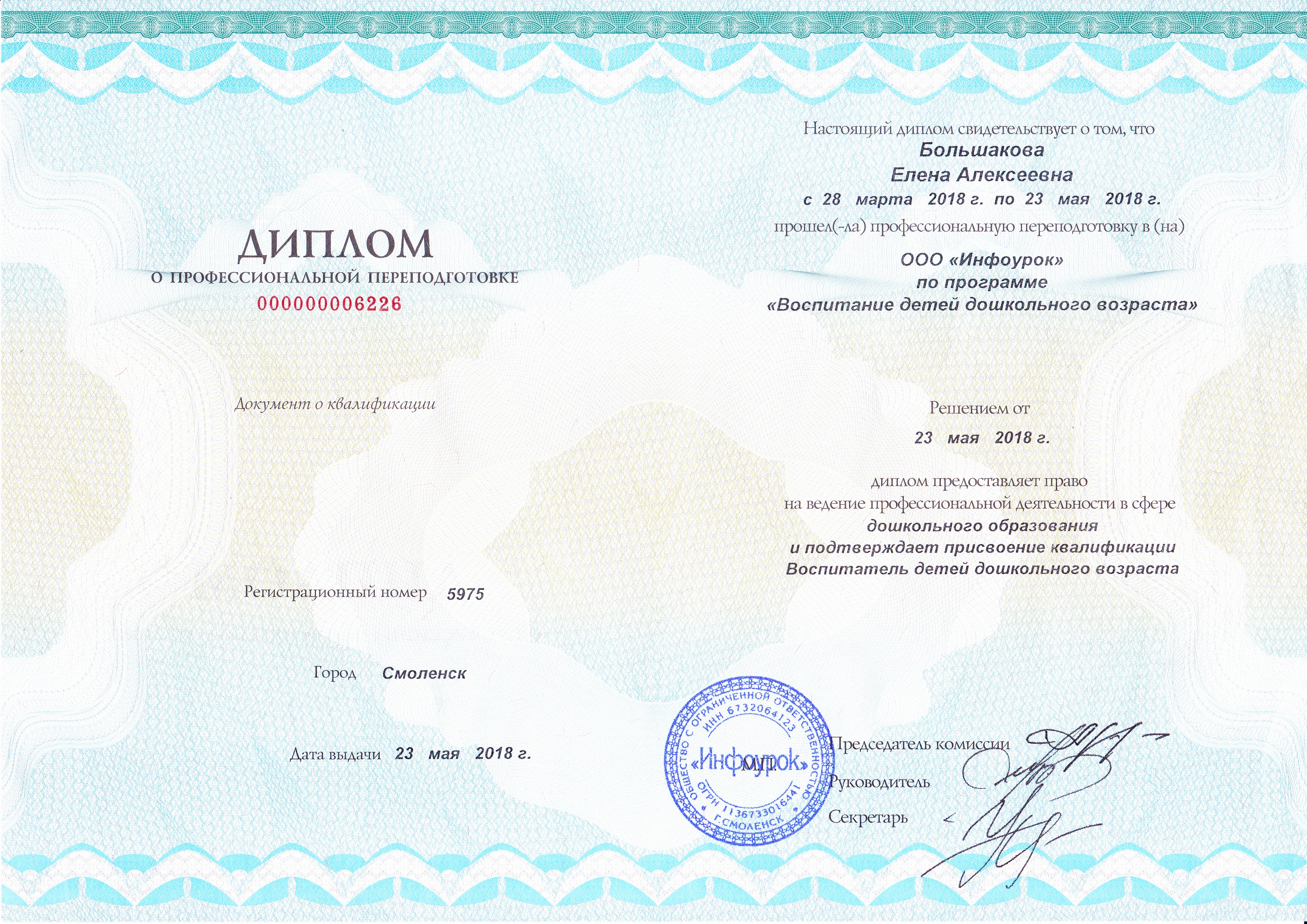 Образование по специальности: по программе "Воспитание детей дошкольного возраста". Присвоена квалификация: Воспитатель детей дошкольного возраста. Документ о получении образования: скачать