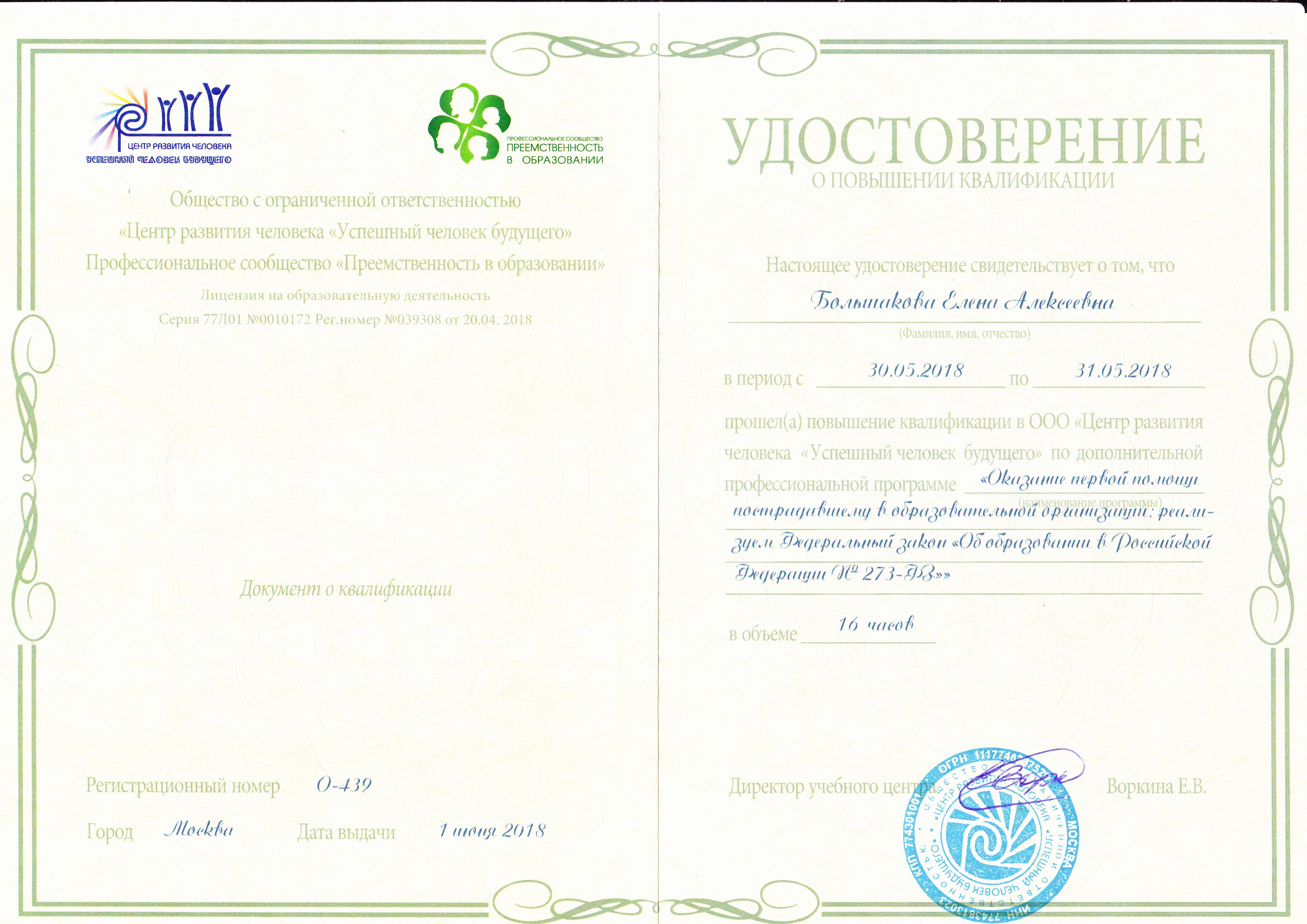 Обучение по курсу: "Оказание первой помощи пострадавшему в образовательной организации: реализуем Федеральный закон "Об образовании в Российской Федерации № 273-ФЗ"". Документ о повышении квалификации: скачать