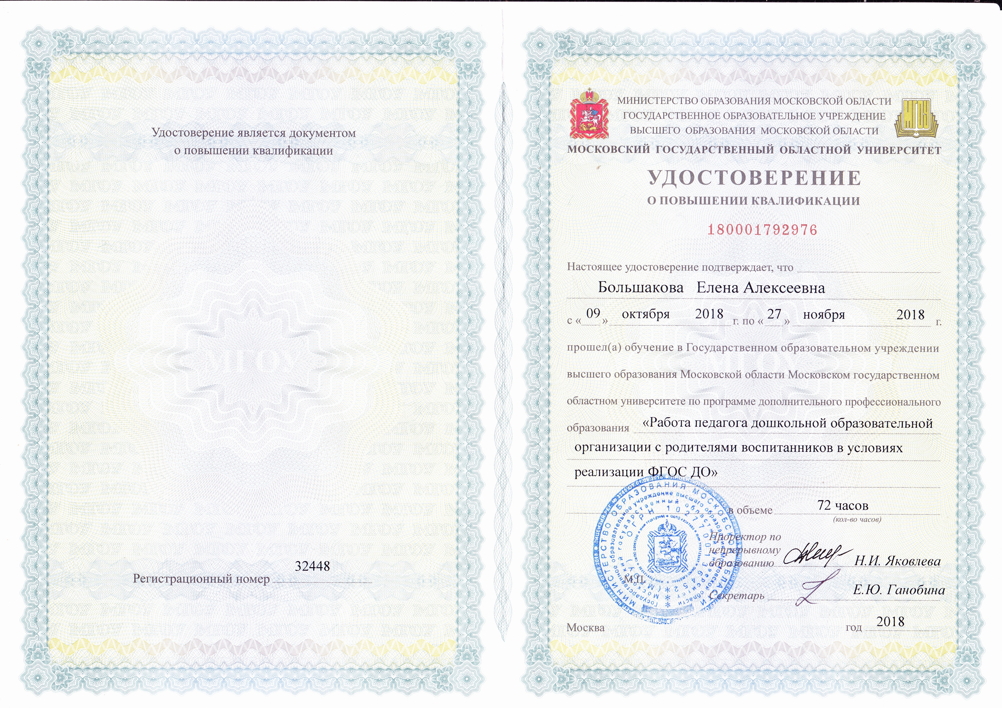 Обучение по курсу: "Работа педагога дошкольной образовательной организации с родителями воспитанников в условиях реализации ФГОС ДО". Документ о повышении квалификации: скачать