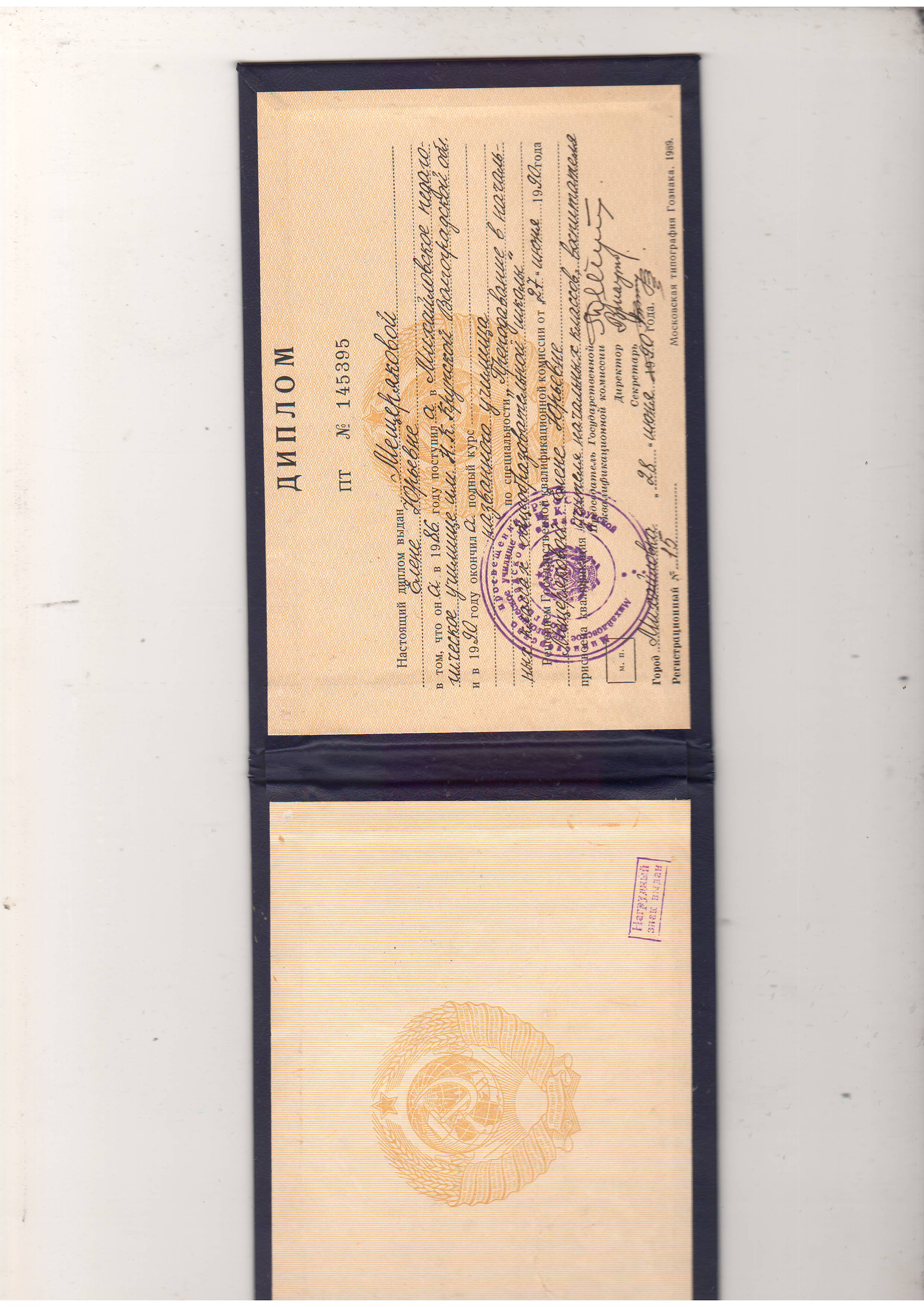 Образование по специальности: среднее специальное. Присвоена квалификация: учитель начальных классов, воспитатель. Документ о получении образования: скачать