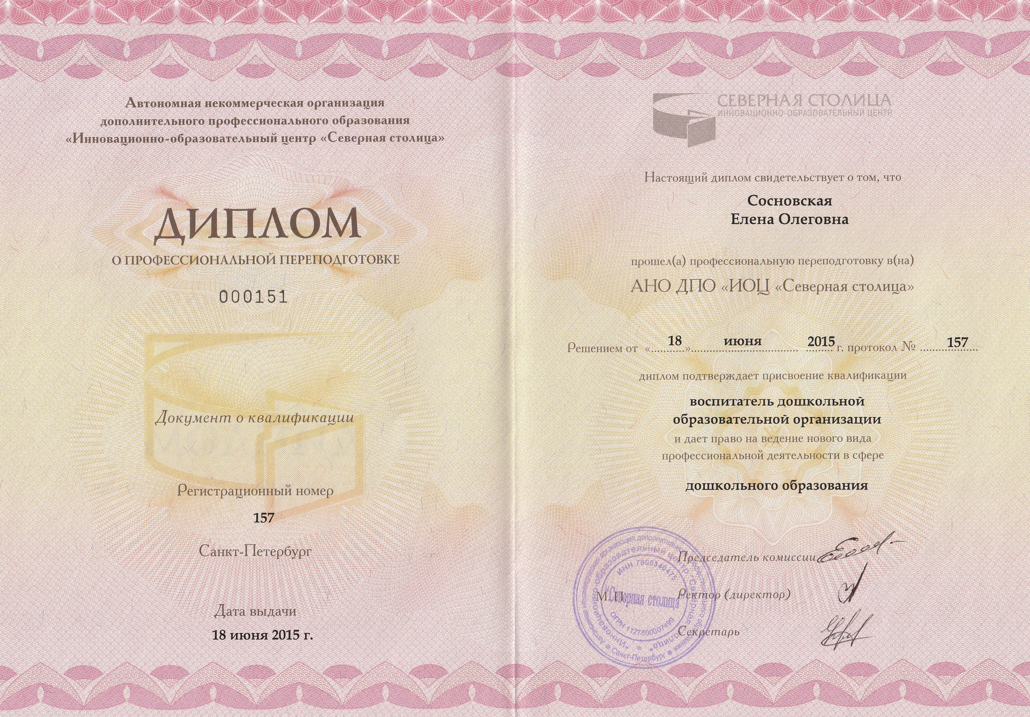 Образование по специальности: «Воспитатель дошкольной образовательной организации». Присвоена квалификация: «Воспитатель дошкольной образовательной организации». Документ о получении образования: скачать