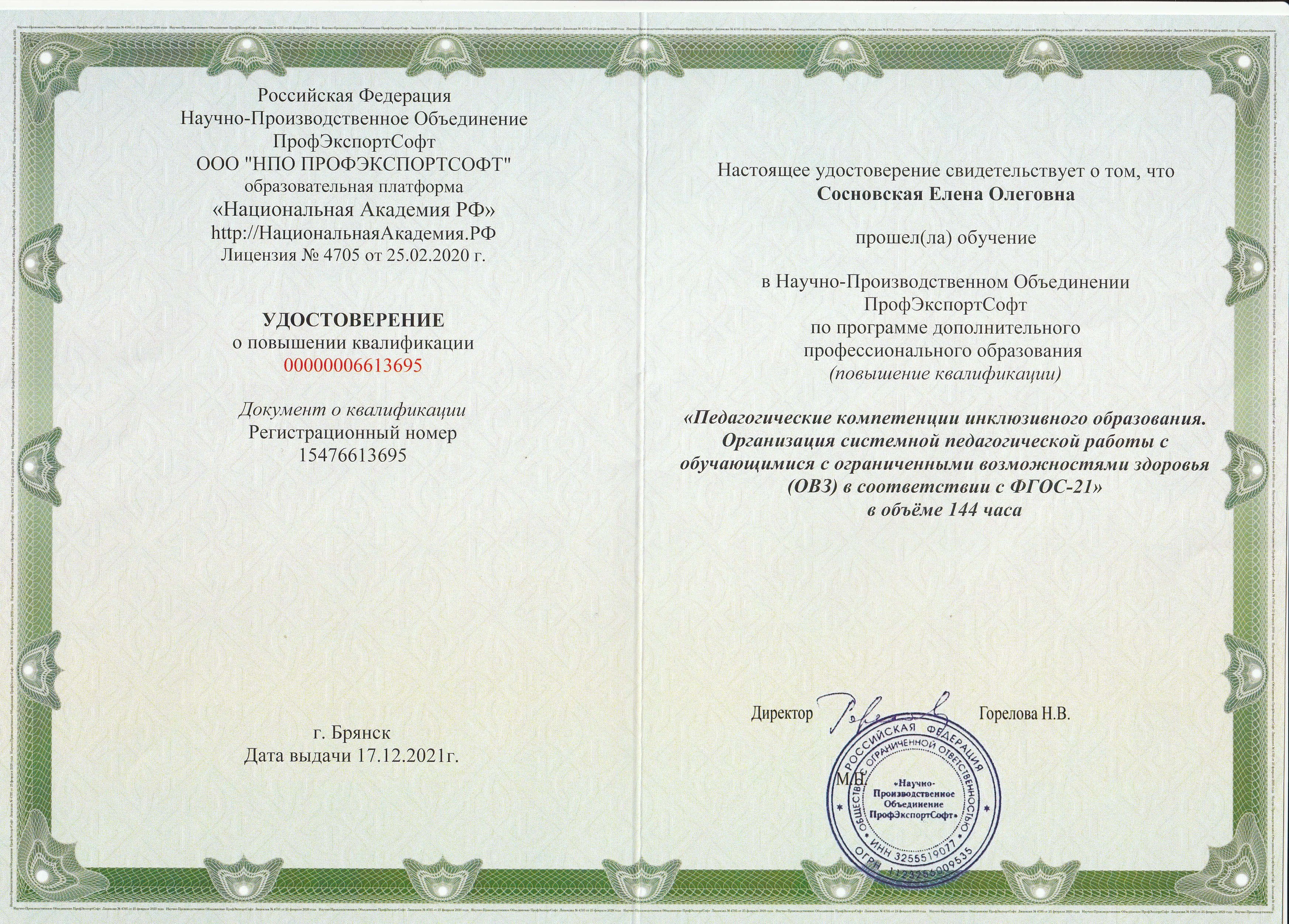 Обучение по курсу: "Педагогические компетенции инклюзивного образования. Организация системной педагогической работы с обучающимися с ограниченными возможностями здоровья (ОВЗ) в соответствии с ФГОС-21" в объёме 144 часа. Документ о повышении квалификации: скачать