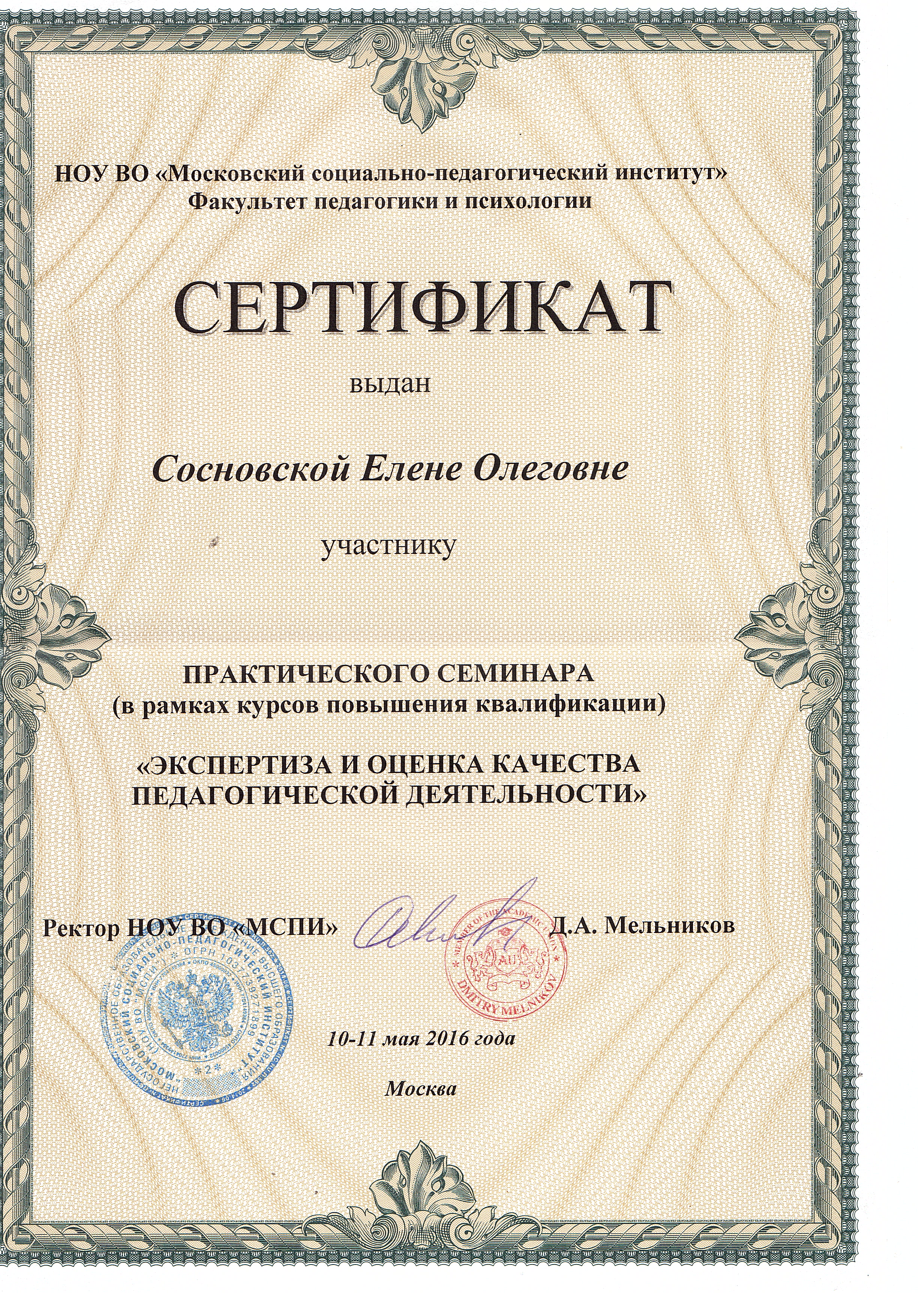 Обучение по курсу: Практический семинар (в рамках курсов повышения квалификации) "Экспертиза и оценка качества педагогической деятельности" . Документ о повышении квалификации: скачать