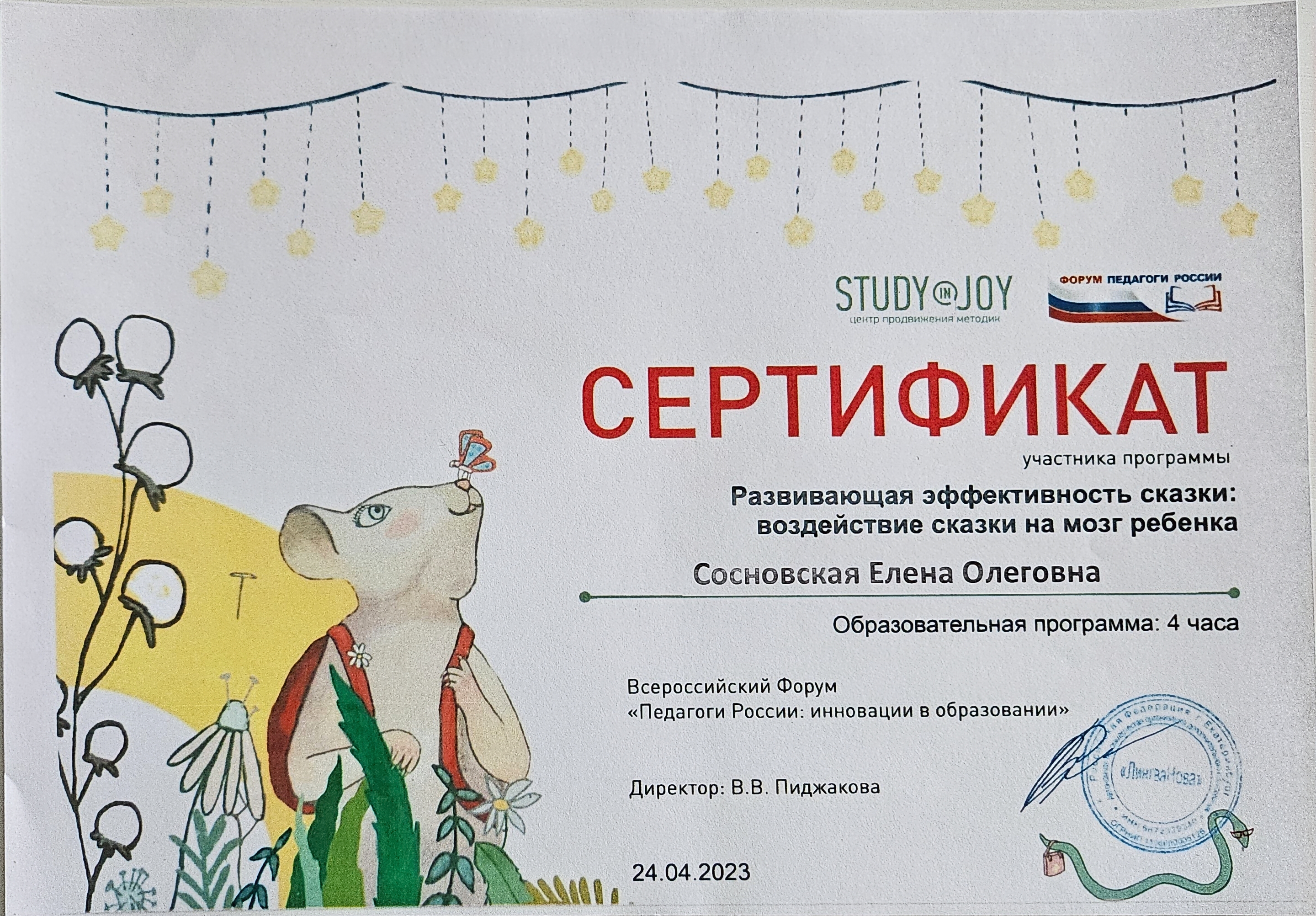 Обучение по курсу: Терапевтическая эффективность сказки: гармонизация психики ребёнка и взрослого сказкой. Документ о повышении квалификации: скачать
