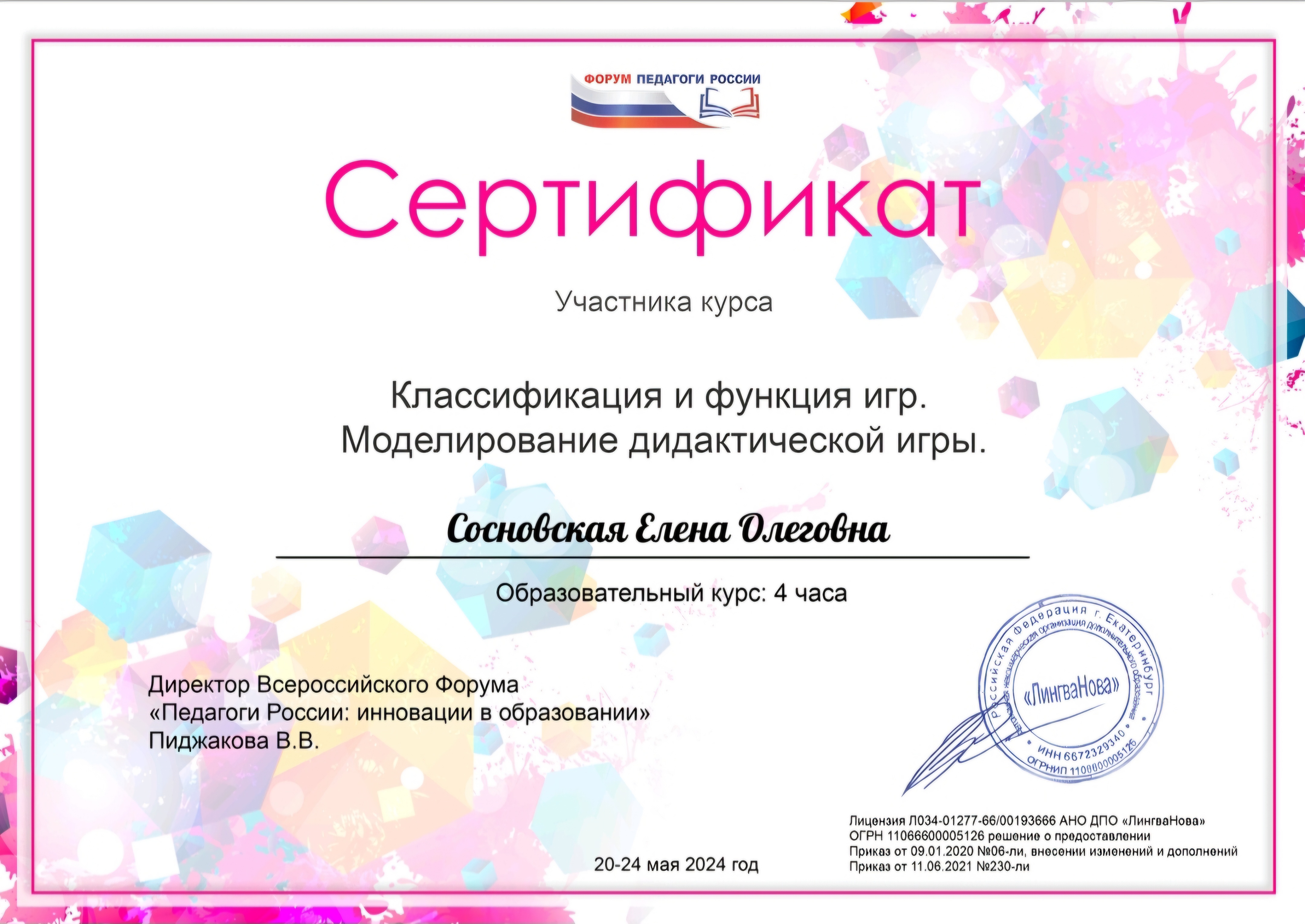 Обучение по курсу: стажировка по изучению инновационного педагогического опыта в рамках областного молодёжного педагогического форума "ВЕКТОР РАЗВИТИЯ" в объёме 16 часов. Документ о повышении квалификации: скачать
