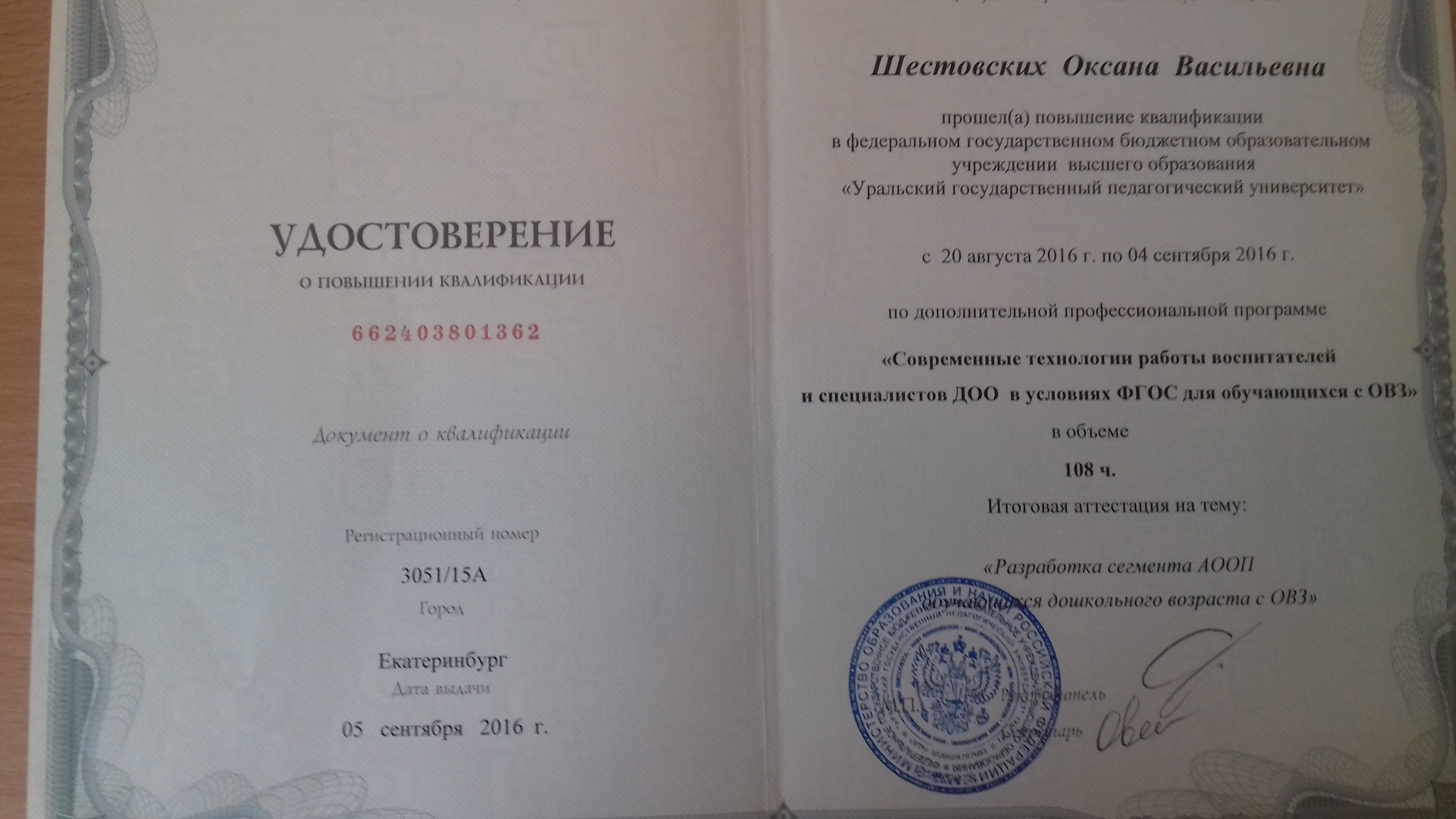 Образование по специальности: "Русский язык ти литература". Присвоена квалификация: учитель русского языка и литературы. Документ о получении образования: скачать