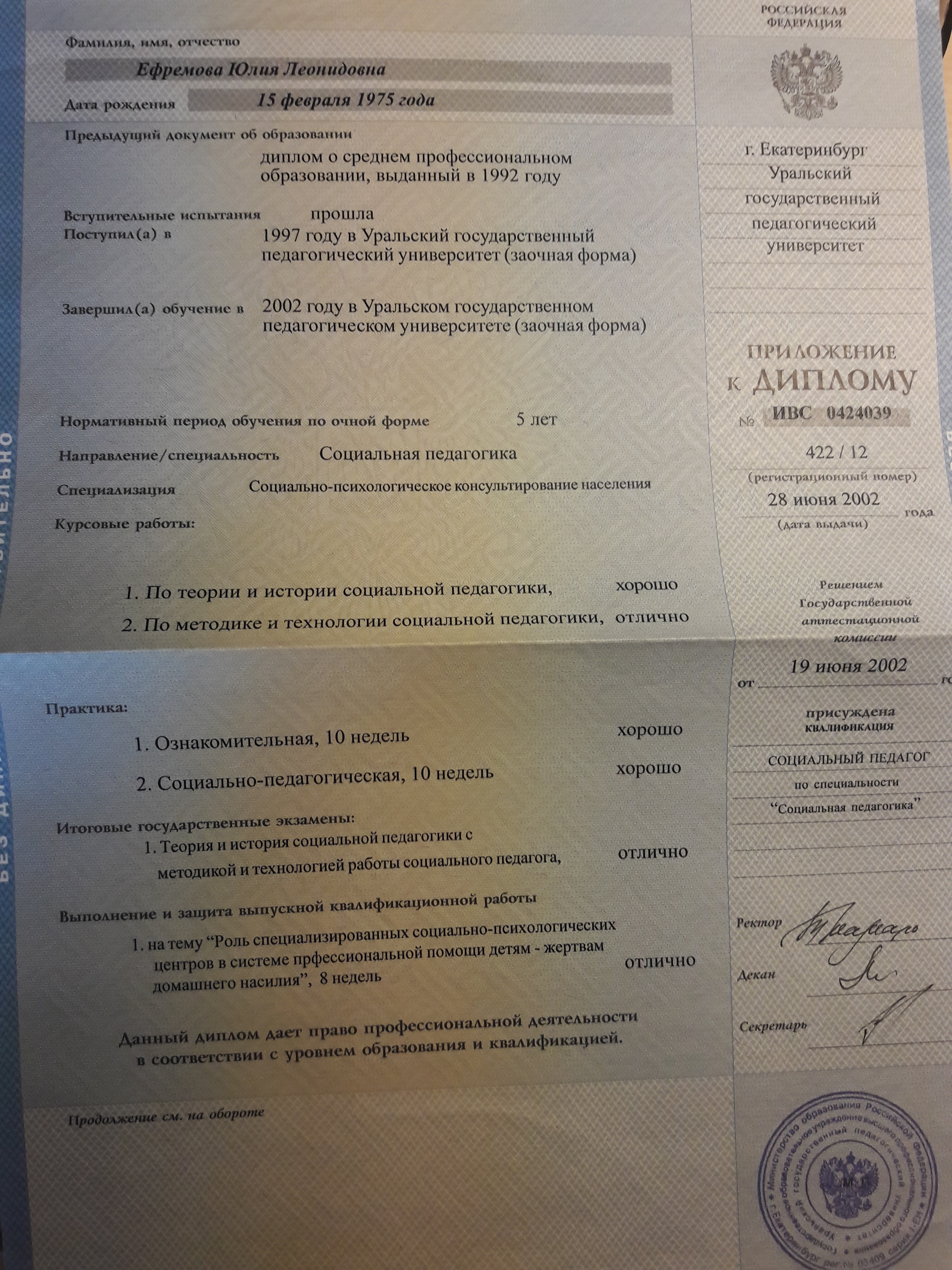 Образование по специальности: "Социальная педагогика". Присвоена квалификация: Социальный педагог- социально-психологическое консультирование населения.. Документ о получении образования: скачать