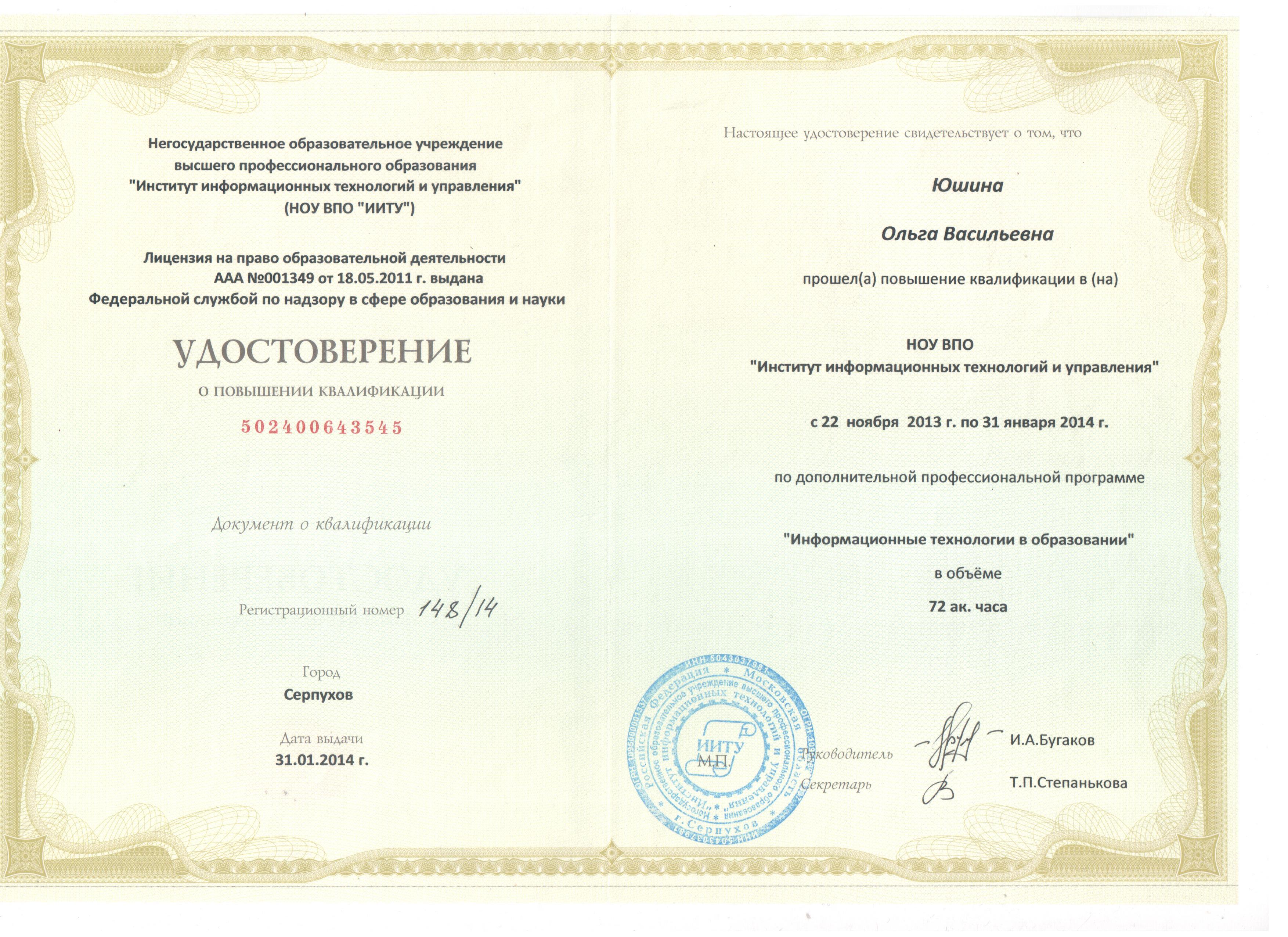 Обучение по курсу: "Информационные технологии в образовании". Документ о повышении квалификации: скачать