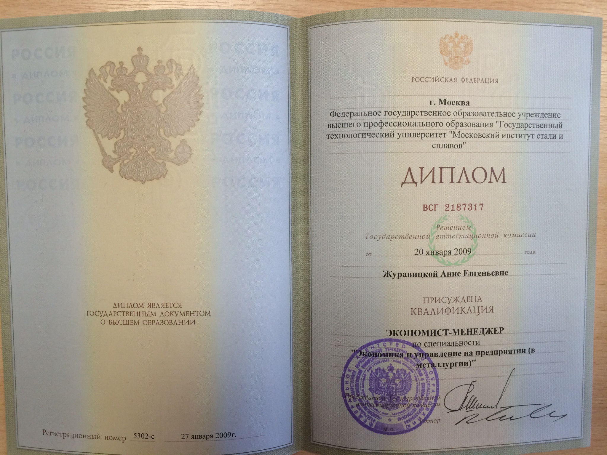 Образование по специальности: Экономика и управление на предприятии (в металлургии). Присвоена квалификация: Экономист-менеджер. Документ о получении образования: скачать
