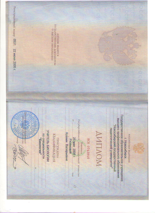 Образование по специальности: Биология. Присвоена квалификация: учитель биологии. Документ о получении образования: скачать