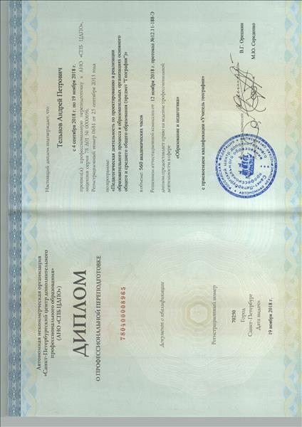 Образование по специальности: "Педагогическая деятельность по проектированию и реализации образовательного процесса в образовательных организациях основного общего и среднего общего образования (предмет "География"). Присвоена квалификация: Учитель географии. Документ о получении образования: скачать