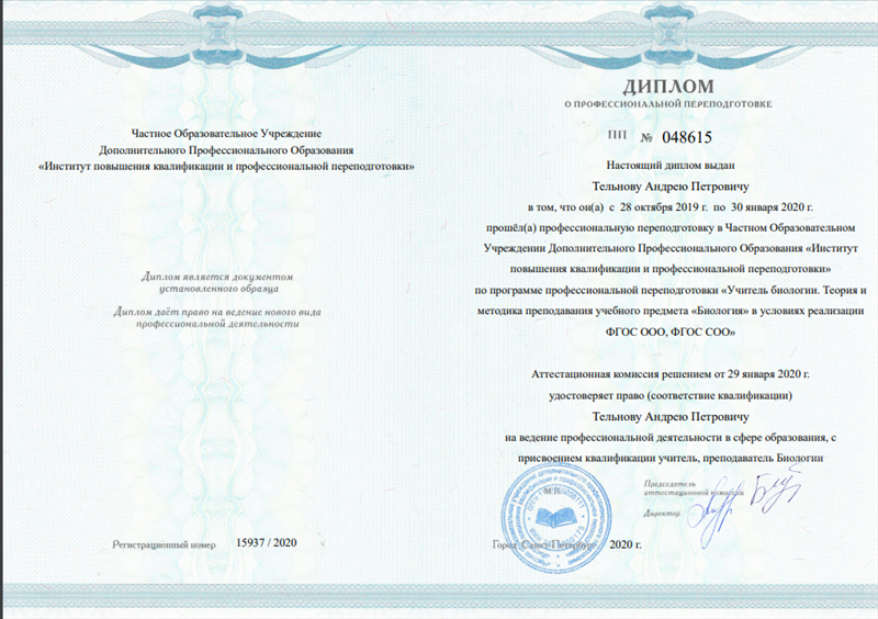 Образование по специальности: "Учитель биологии. Теория и методика преподавания учебного предмета "Биология" в условиях реализации ФГОС ООО, ФГОС СОО. Присвоена квалификация: Учитель биологии. Документ о получении образования: скачать