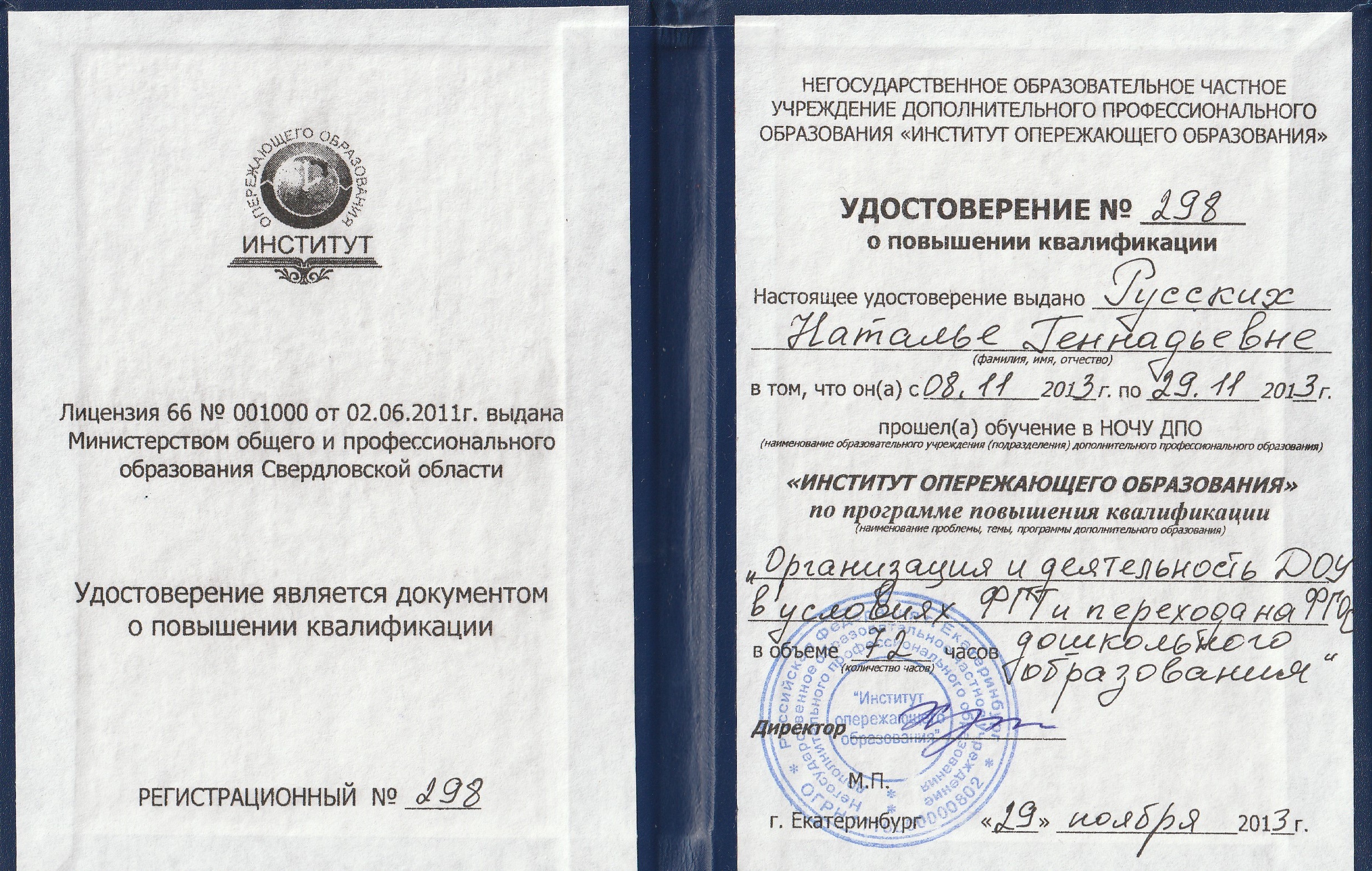 Обучение по курсу: Организация и деятельность ДОУ в условиях ФГТ и перехода на ФГОС дошкольного образования. Документ о повышении квалификации: скачать