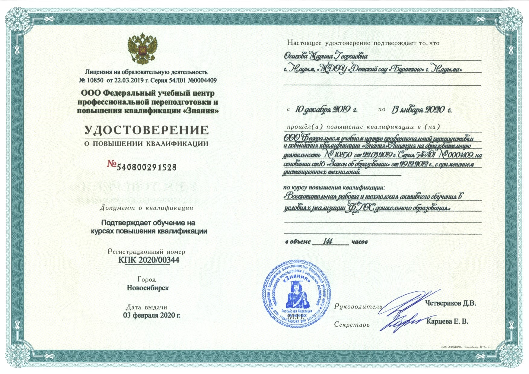 Обучение по курсу: "Воспитательная работа и технология активного обучения в условиях ФГОс дошкольного образования",144 ч.. Документ о повышении квалификации: скачать