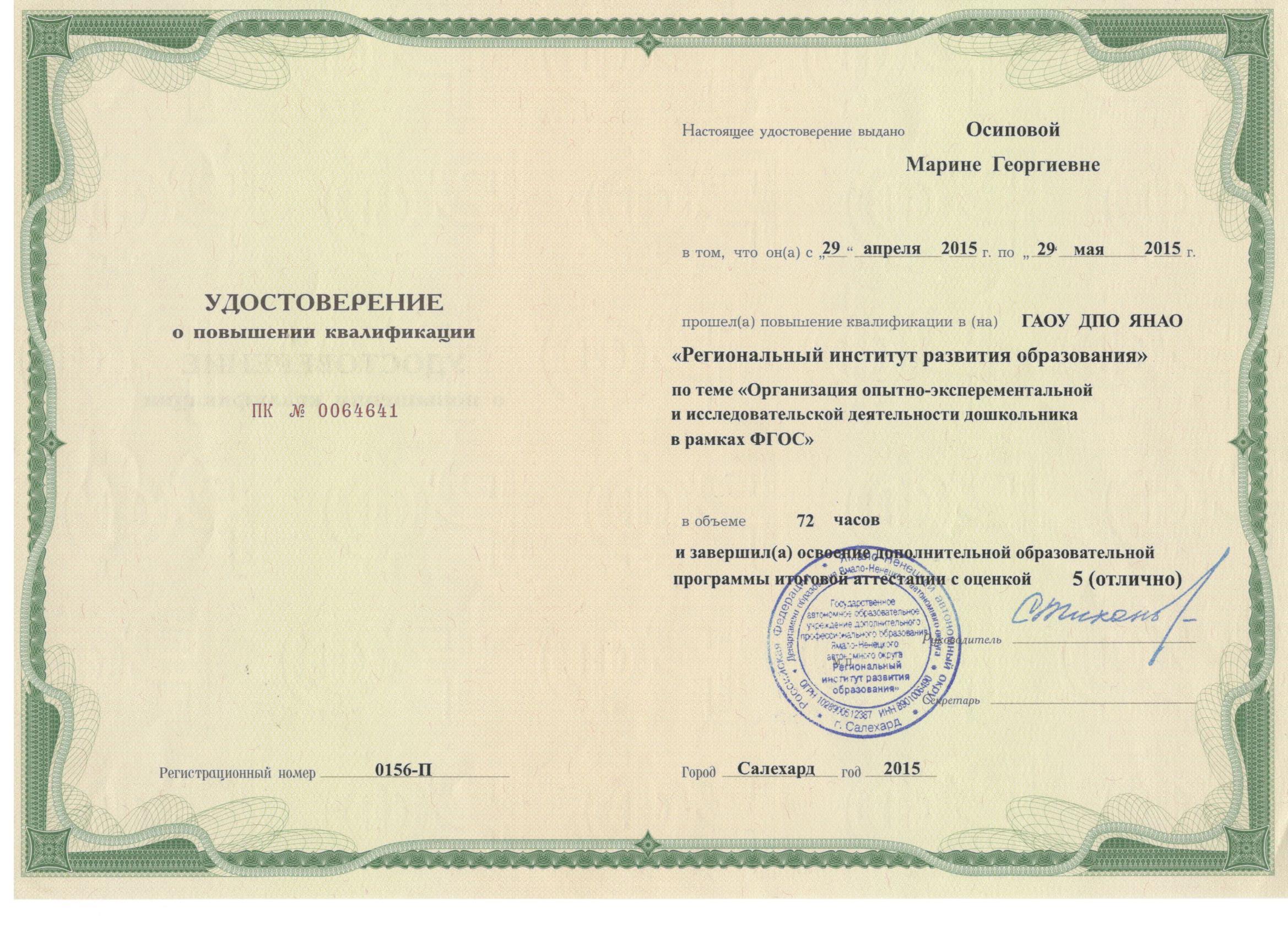 Обучение по курсу: «Организация опытно-экспериментальной и исследовательской деятельности дошкольника в рамках ФГОС» , 72 ч.. Документ о повышении квалификации: скачать