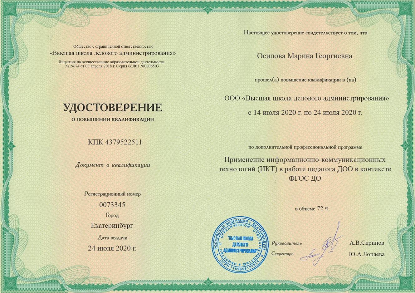 Обучение по курсу: "Применение информационно-коммуникационных технологий (ИКТ) в работе педагога в контексте ФГОС ДО",72 ч.. Документ о повышении квалификации: скачать