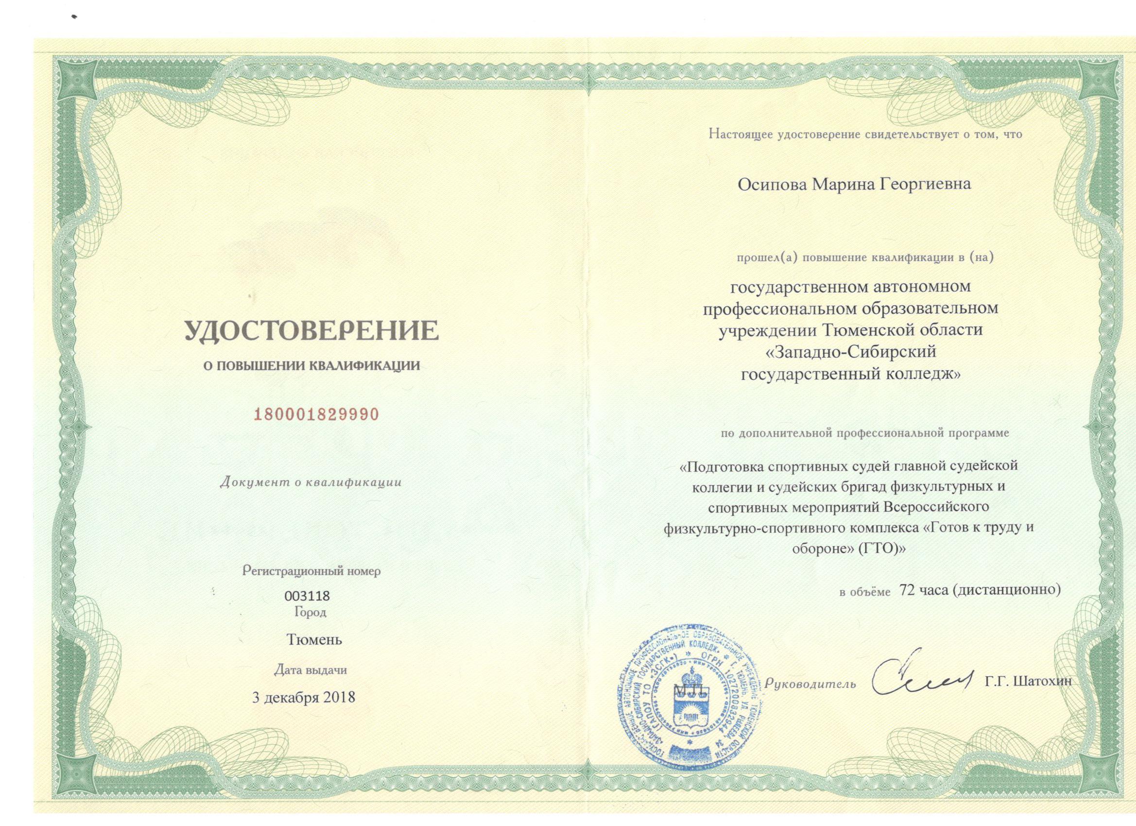 Обучение по курсу: "Подготовка спортивных судей главной судейской коллегии и судейских бригад физкультурных и спортивных мероприятий Всероссийского физкультурно-спортивного комплекса "Готов к труду и обороне"(ГТО),72 ч.. Документ о повышении квалификации: скачать