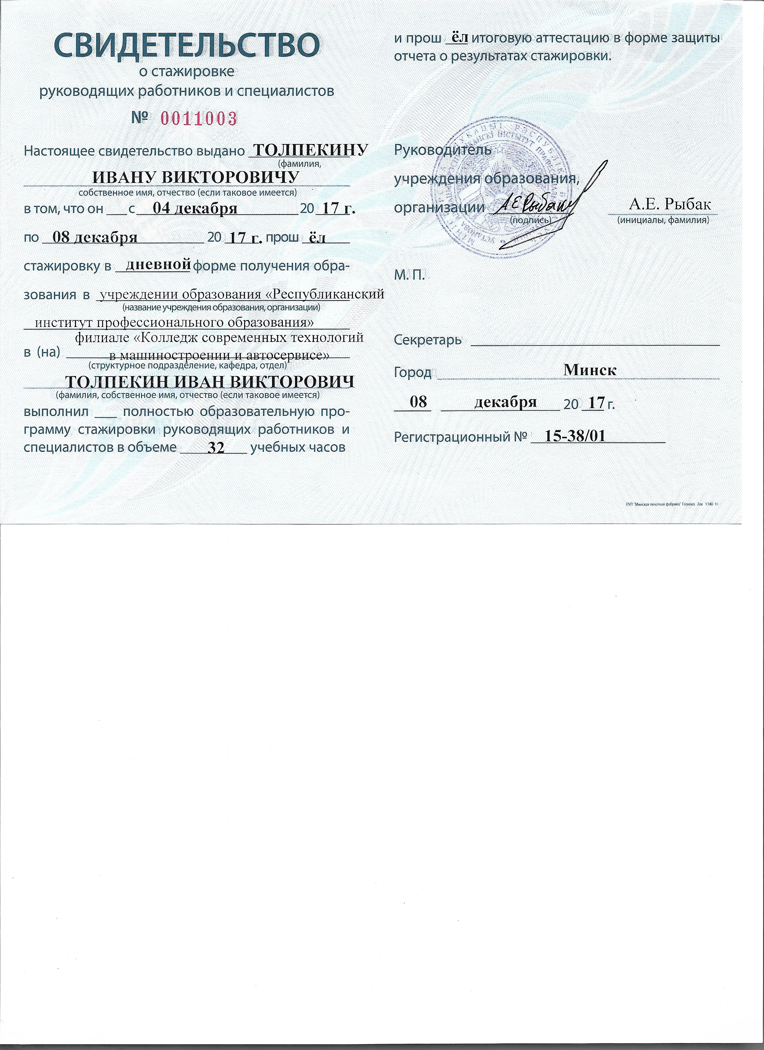 Обучение по курсу: Стажировка руководящих работников и специалистов. Документ о повышении квалификации: скачать