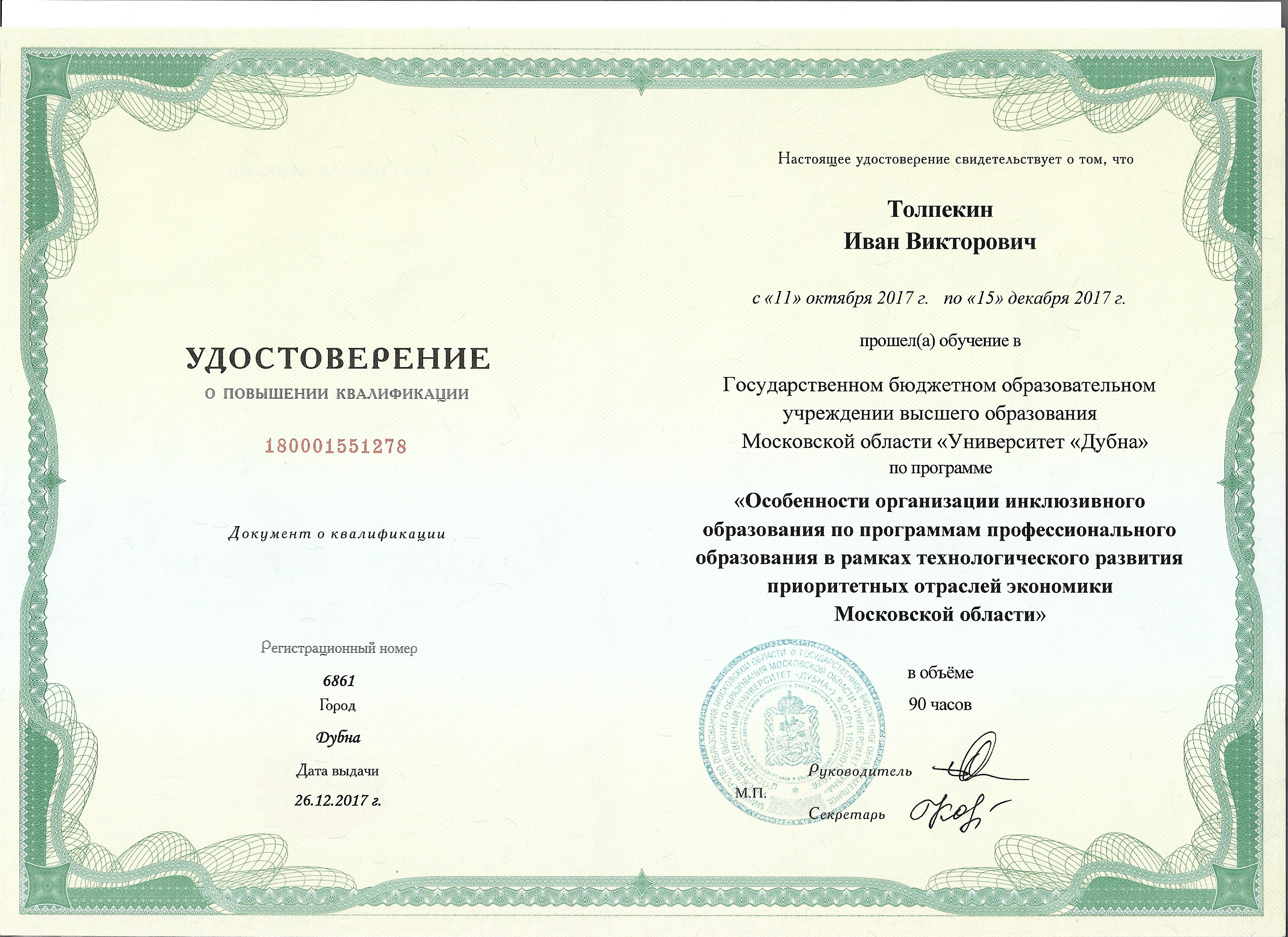 Обучение по курсу: Особенности организации инклюзивного образования по программам профессионального образования в рамках технологического развития приоритетных отраслей экономики Московской области. Документ о повышении квалификации: скачать