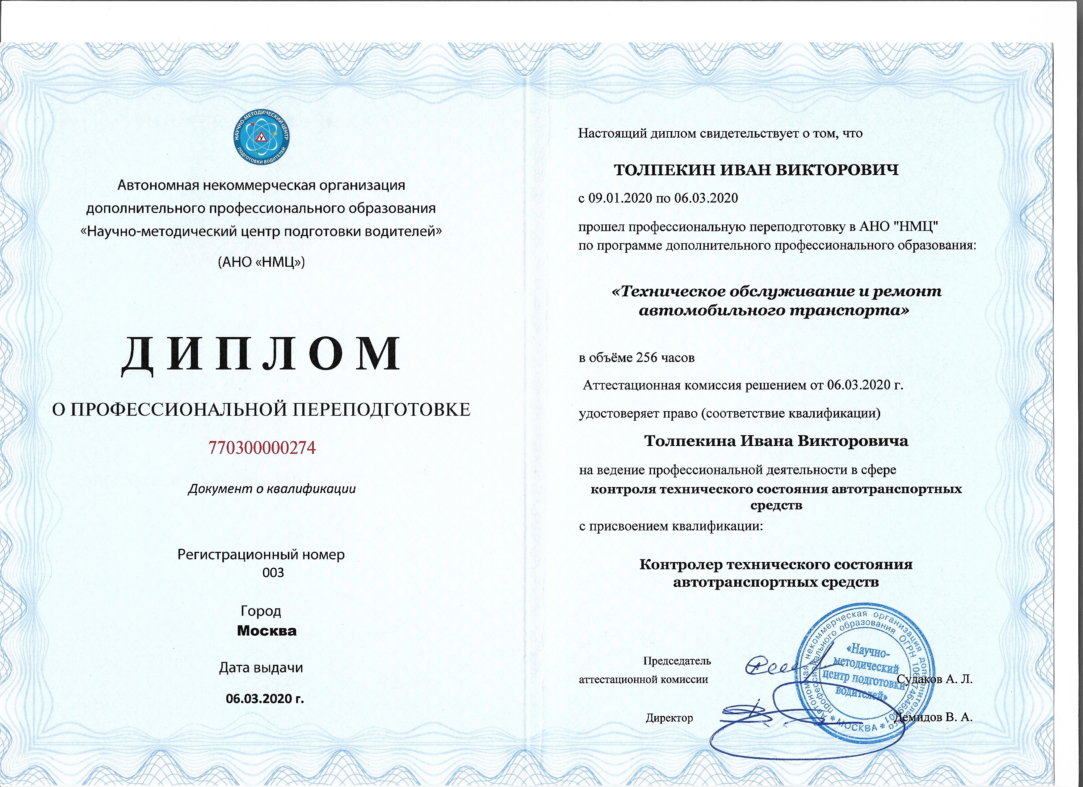 Образование по специальности: Техническое обслуживание и ремонт автомобильного транспорта. Присвоена квалификация: Контролер технического состояния автотранспортных средств. Документ о получении образования: скачать