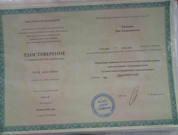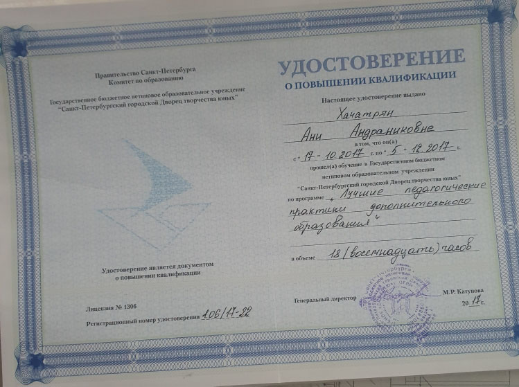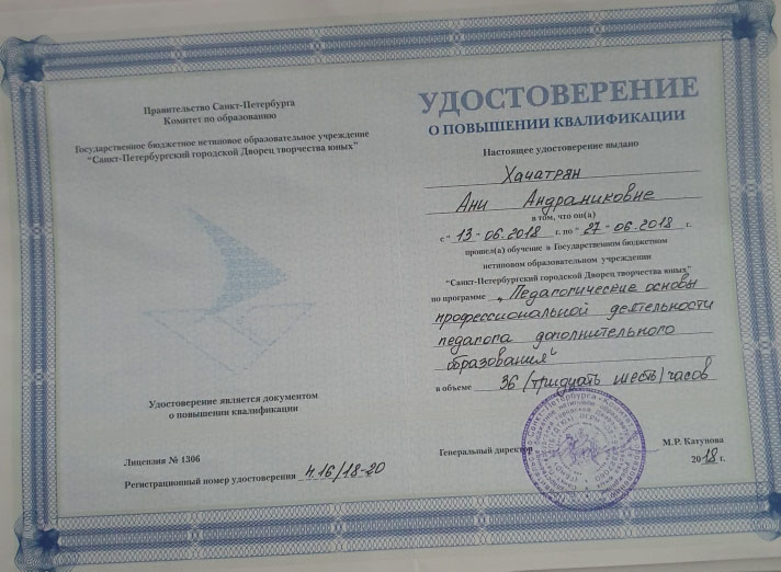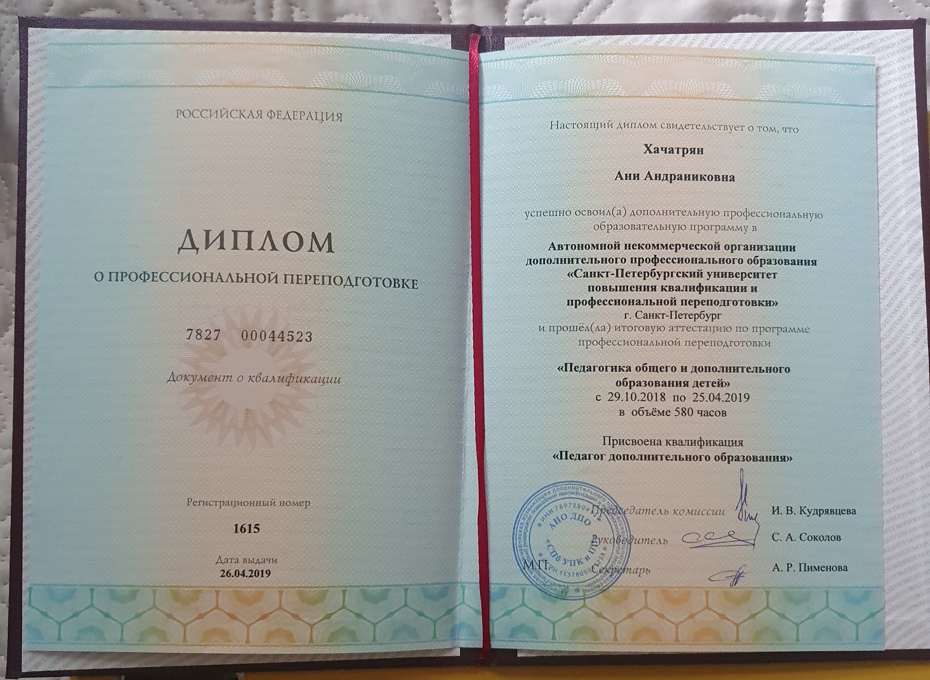 Образование по специальности: «Педагогика общего и дополнительного образования детей»,. Присвоена квалификация: «Педагог дополнительного образования». Документ о получении образования: скачать
