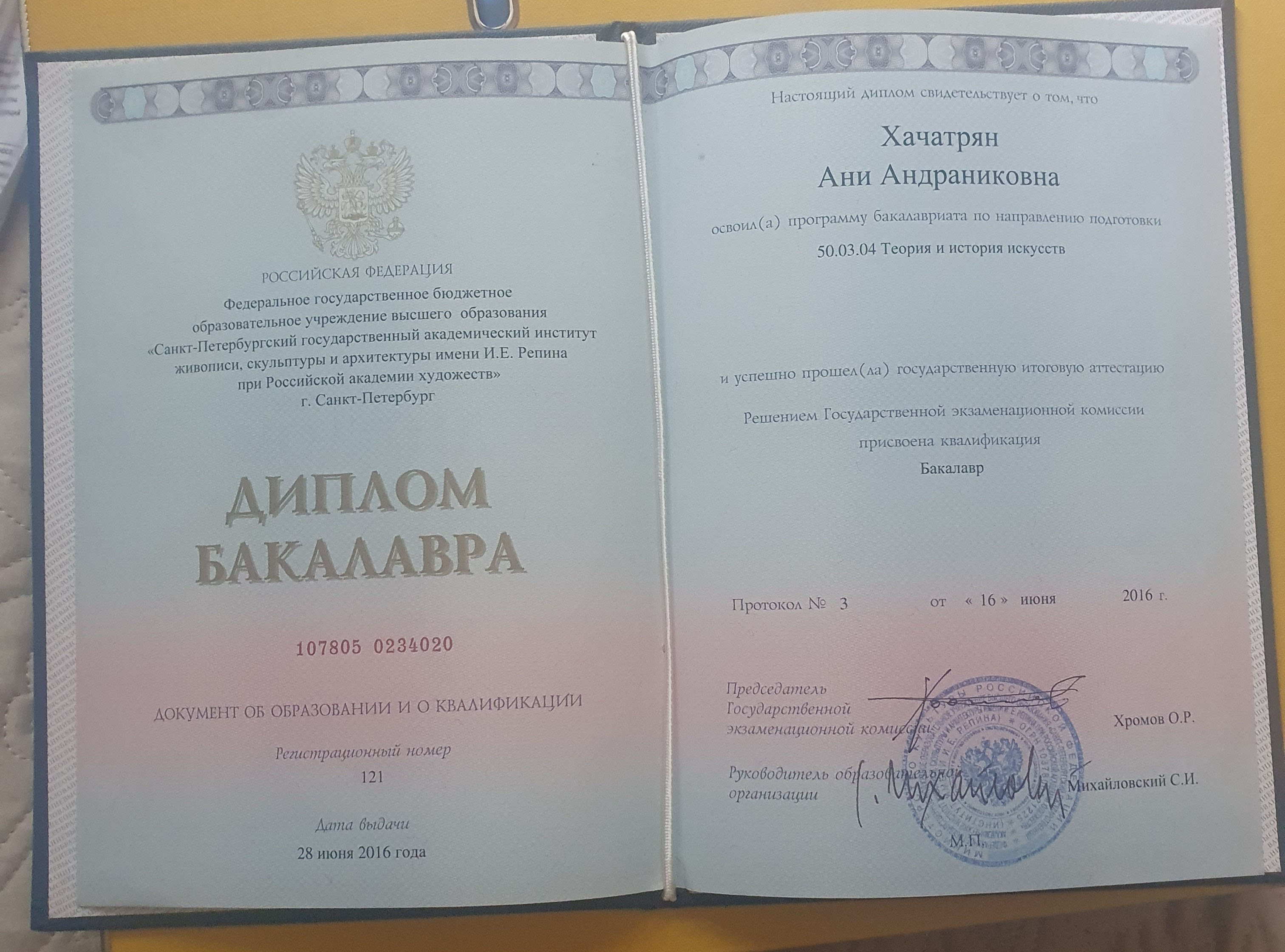 Образование по специальности: Теория и история искусств. Присвоена квалификация: Искусствовед . Документ о получении образования: скачать