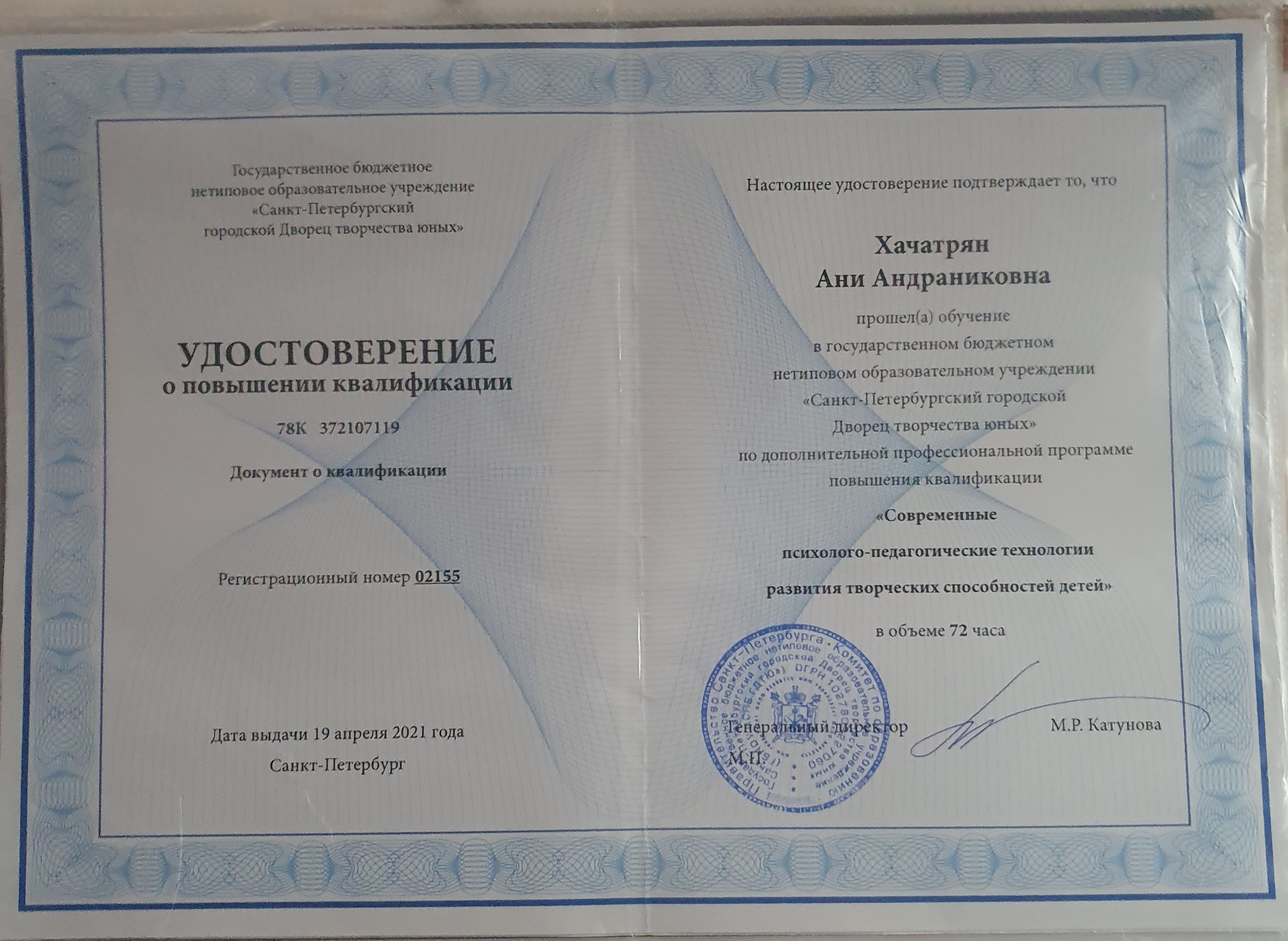 Обучение по курсу: "Современные психолого- педагогические технологии развития творческих способностей детей". Документ о повышении квалификации: скачать