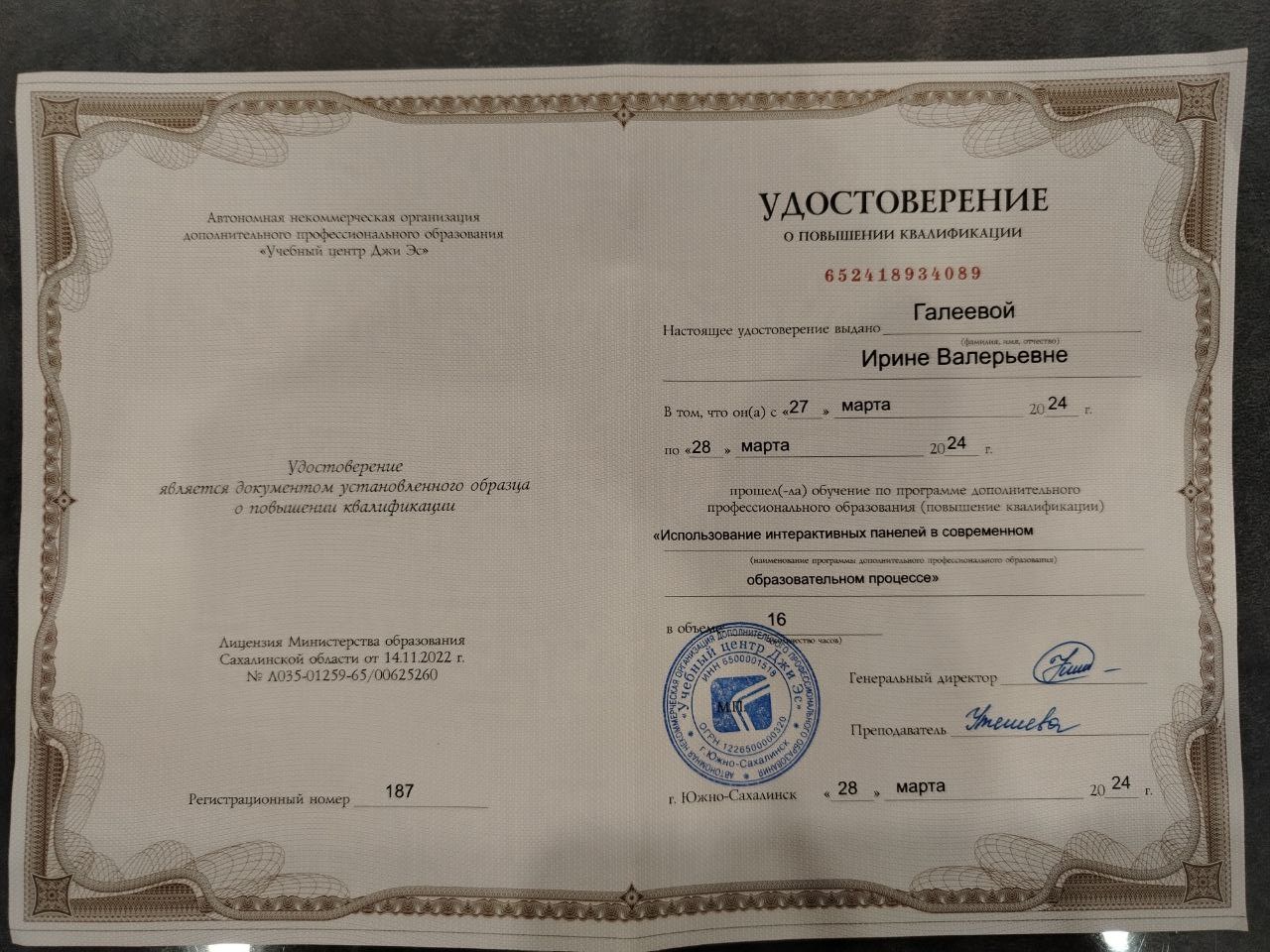 Обучение по курсу: Использование интерактивных панелей в современном образовательном процессе". Документ о повышении квалификации: скачать