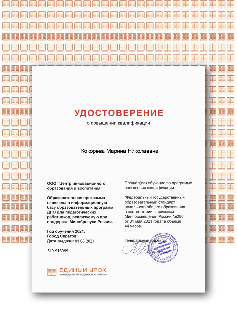Обучение по курсу: «Федеральный государственный образовательный стандарт начального общего образования в соответствии с приказом Минпросвещения России №286 от 31 мая 2021 года». Документ о повышении квалификации: скачать
