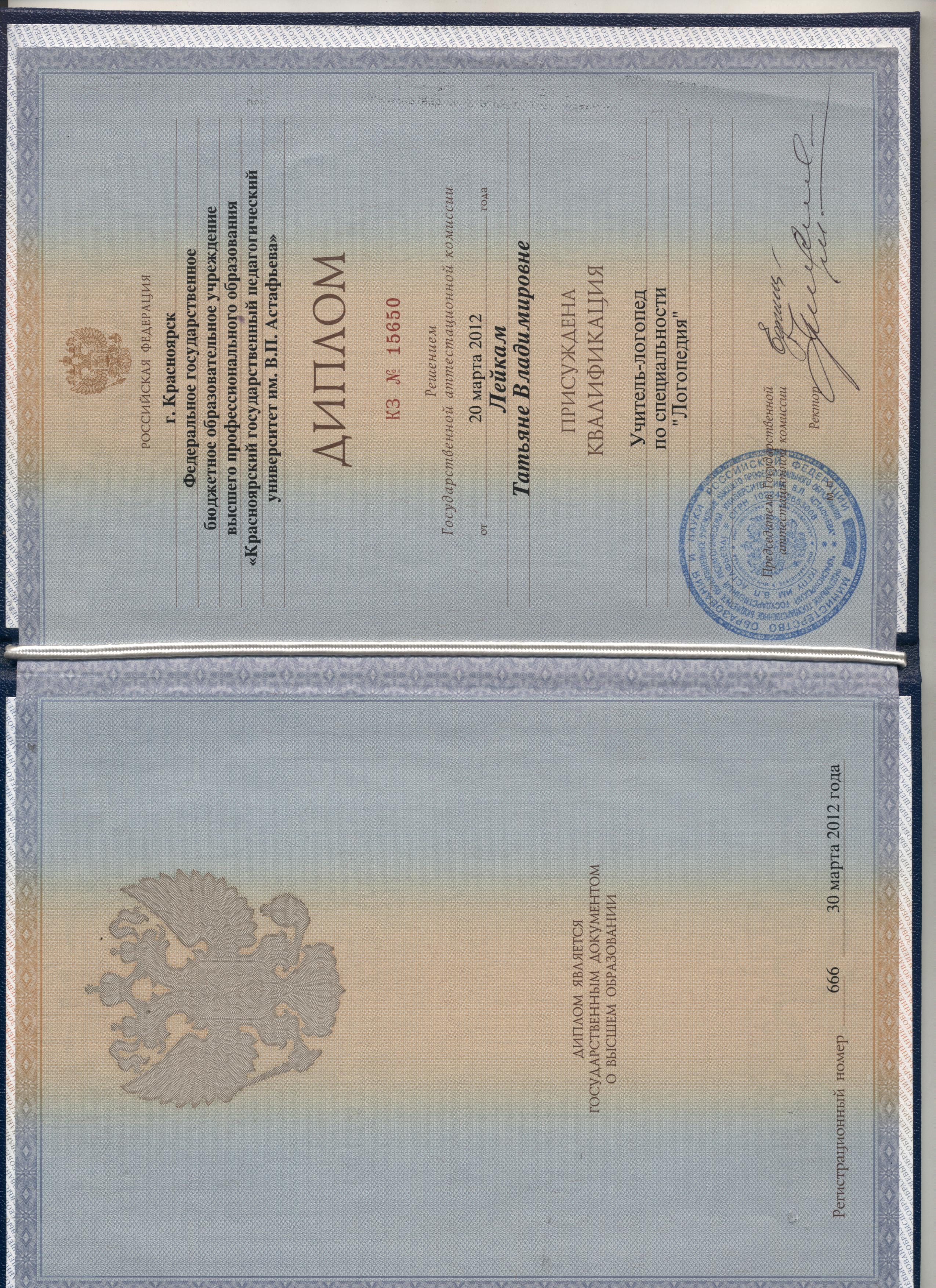 Образование по специальности: Логопедия . Присвоена квалификация: Учитель-логопед. Документ о получении образования: скачать
