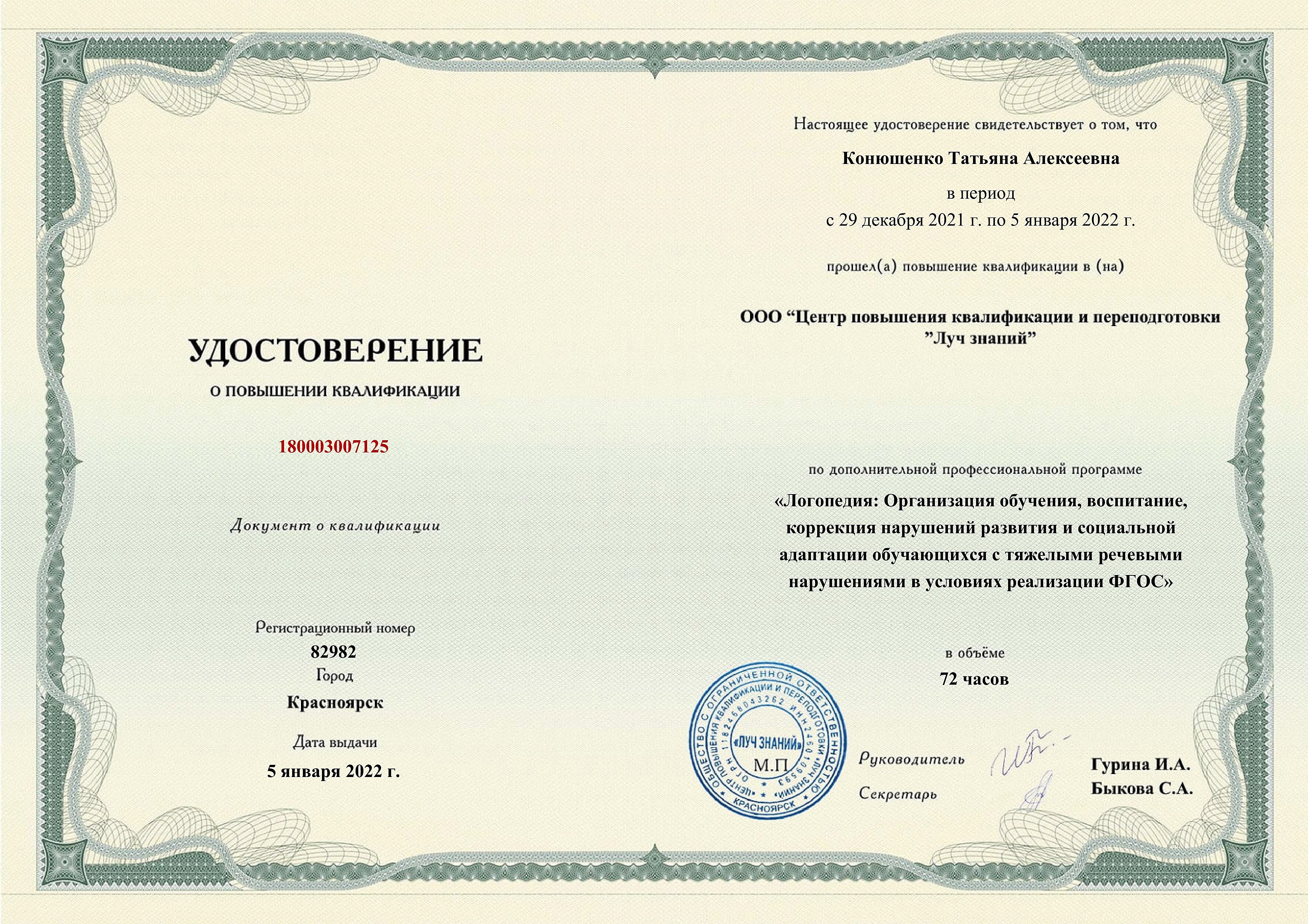 Обучение по курсу: "Логопедия: Организация обучения, воспитание, коррекция нарушений развития и социальной адаптации обучающихся с тяжелыми речевыми нарушениями в условиях реализации ФГОС" в объеме 72 часов. Документ о повышении квалификации: скачать