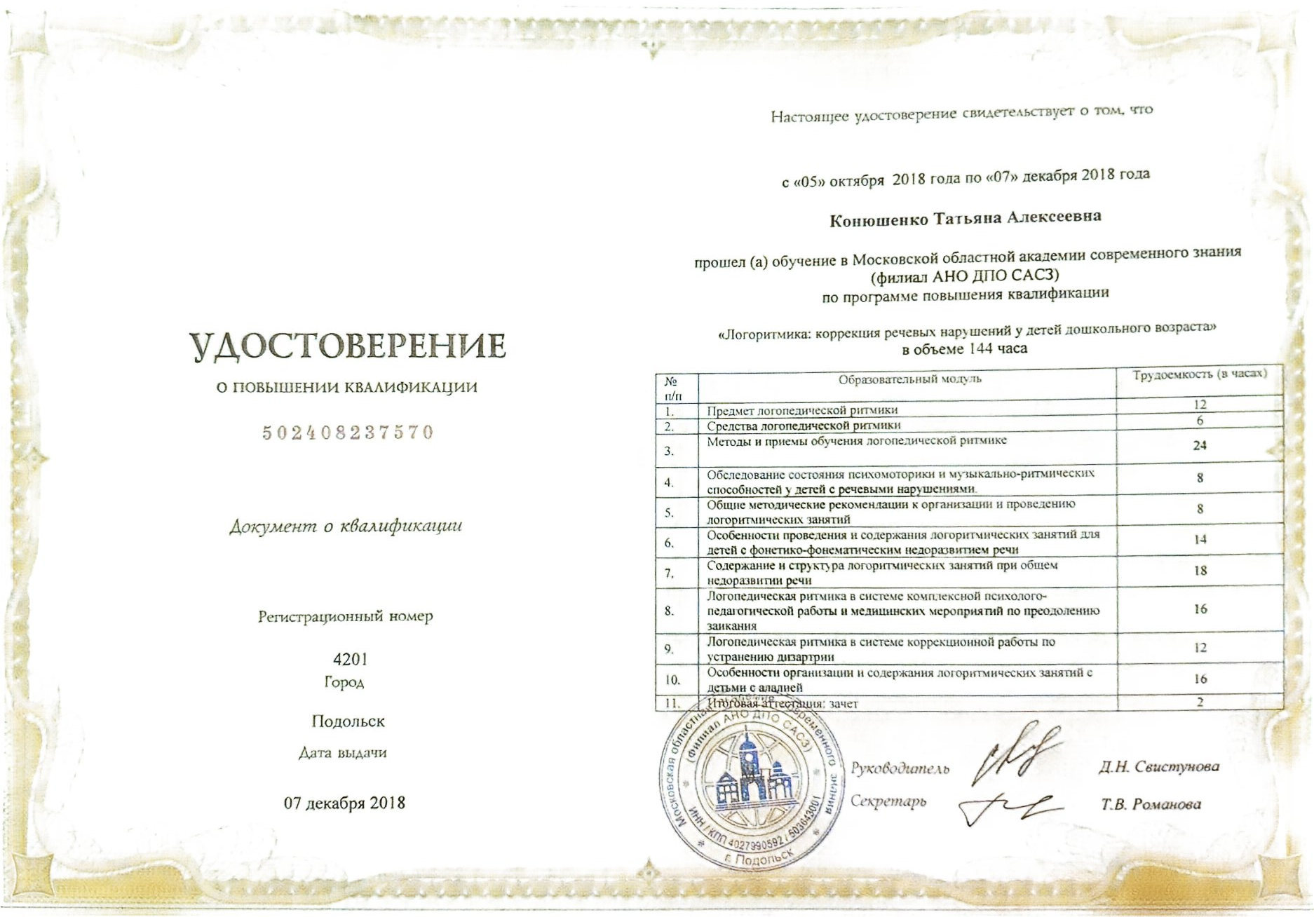 Обучение по курсу: "Логоритмика: коррекция речевых нарушений у детей дошкольного возраста" в объеме 144 часов. Документ о повышении квалификации: скачать