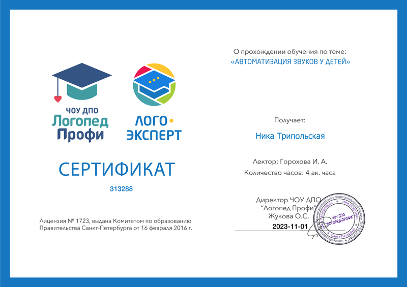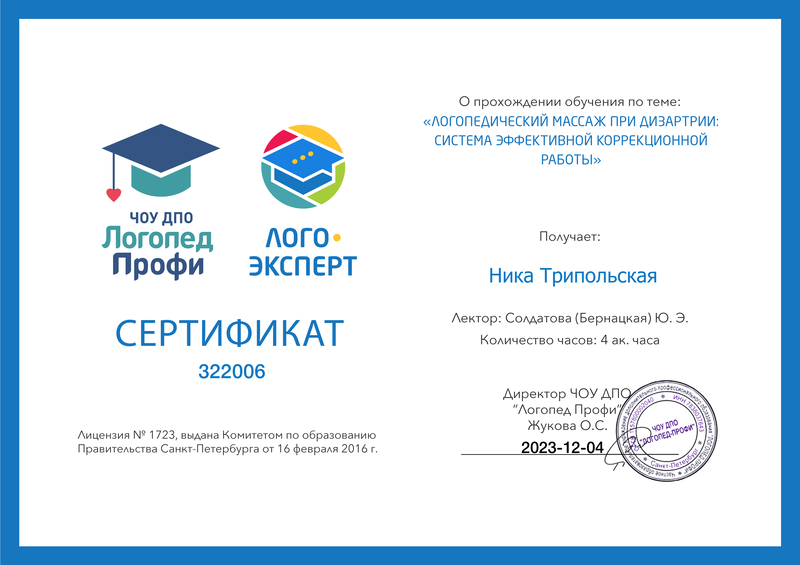 Образование по специальности: Учитель-логопед: Организация профессиональной деятельности в образовательной организации. Присвоена квалификация: Учитель-логопед. Документ о получении образования: скачать