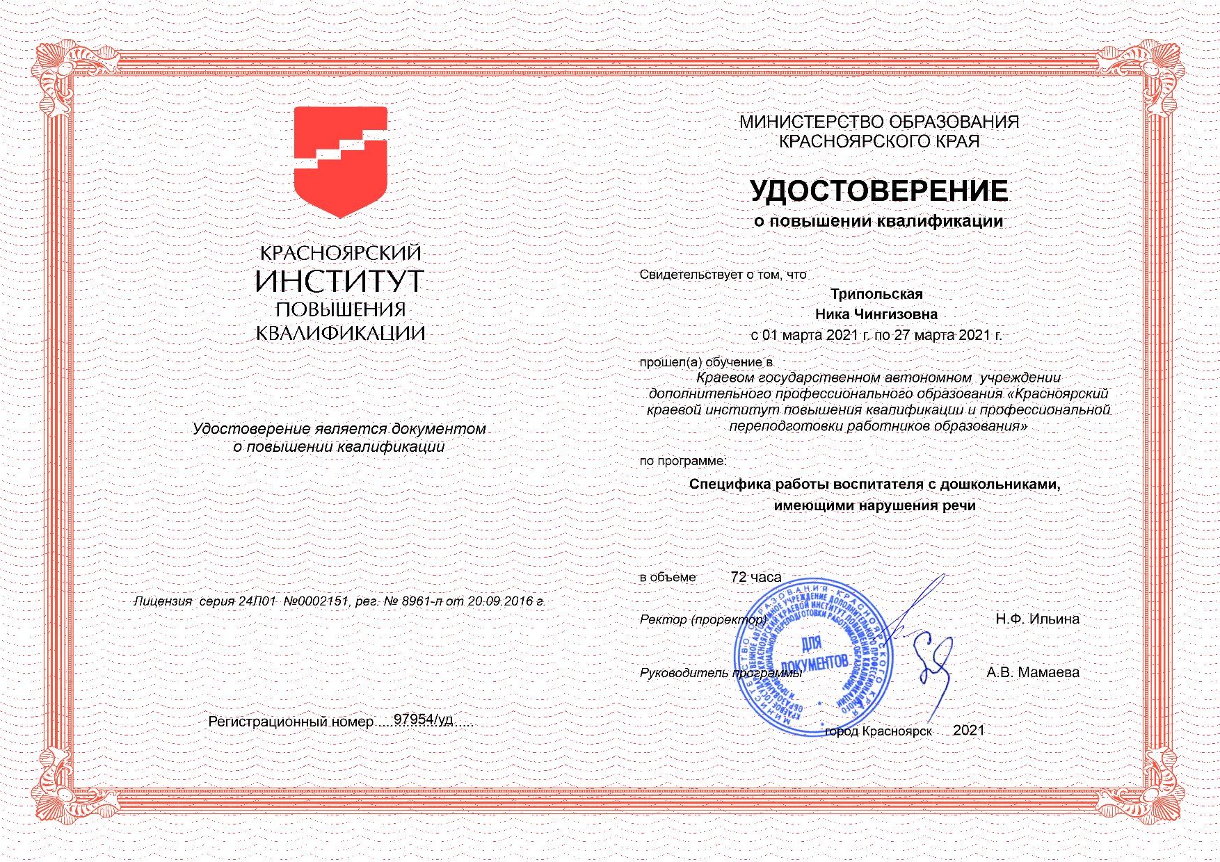Обучение по курсу: Специфика работы воспитателя с дошкольниками, имеющими нарушения речи. Документ о повышении квалификации: скачать