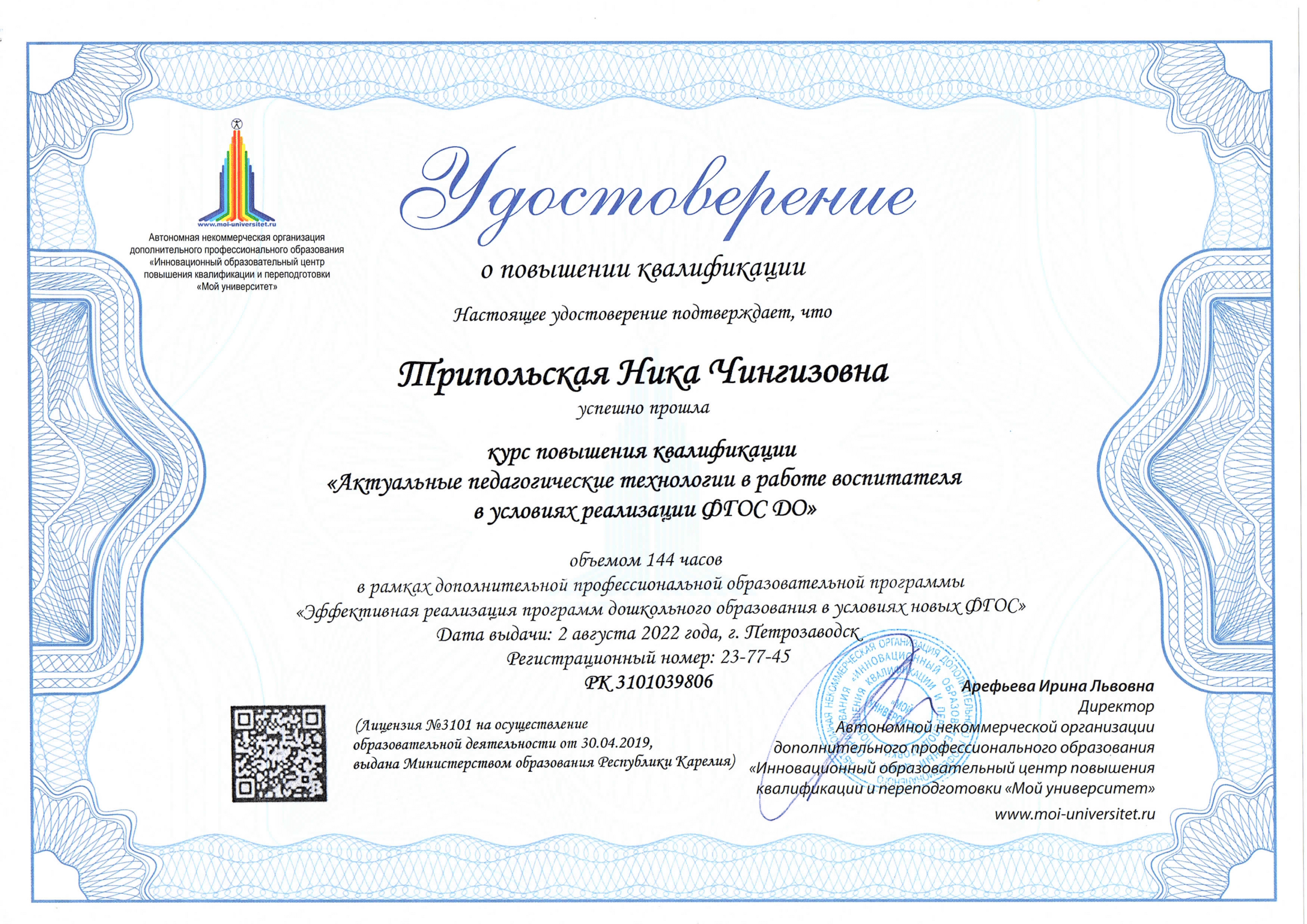 Обучение по курсу: Актуальные педагогические технологии в работе воспитателя в условиях реализации ФГОС ДО. Документ о повышении квалификации: скачать