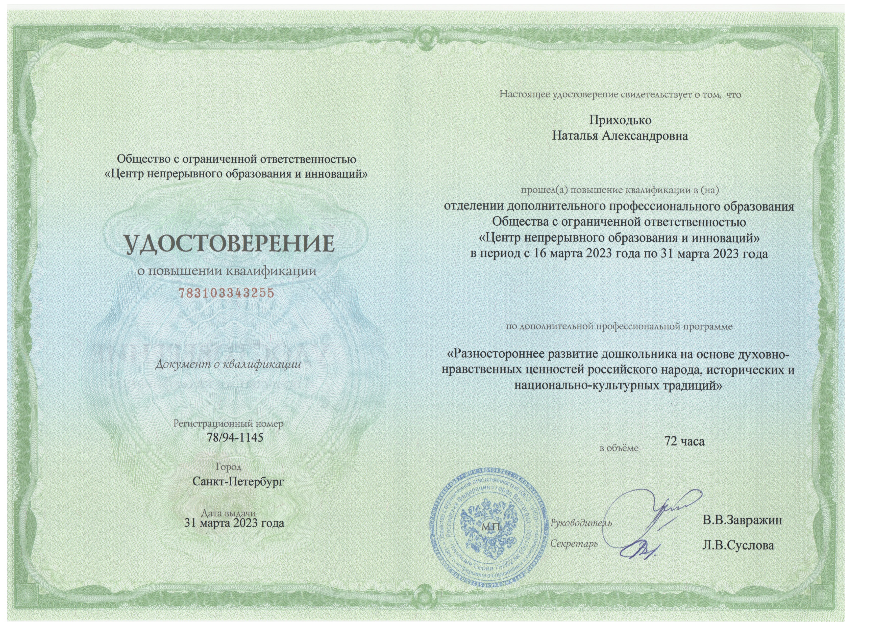 Обучение по курсу: Курс обучения "Разностороннее развитие дошкольника на основе духовно-нравственных ценностей российского народа, исторических и национально- культурных традиций" 72 часа. Документ о повышении квалификации: скачать