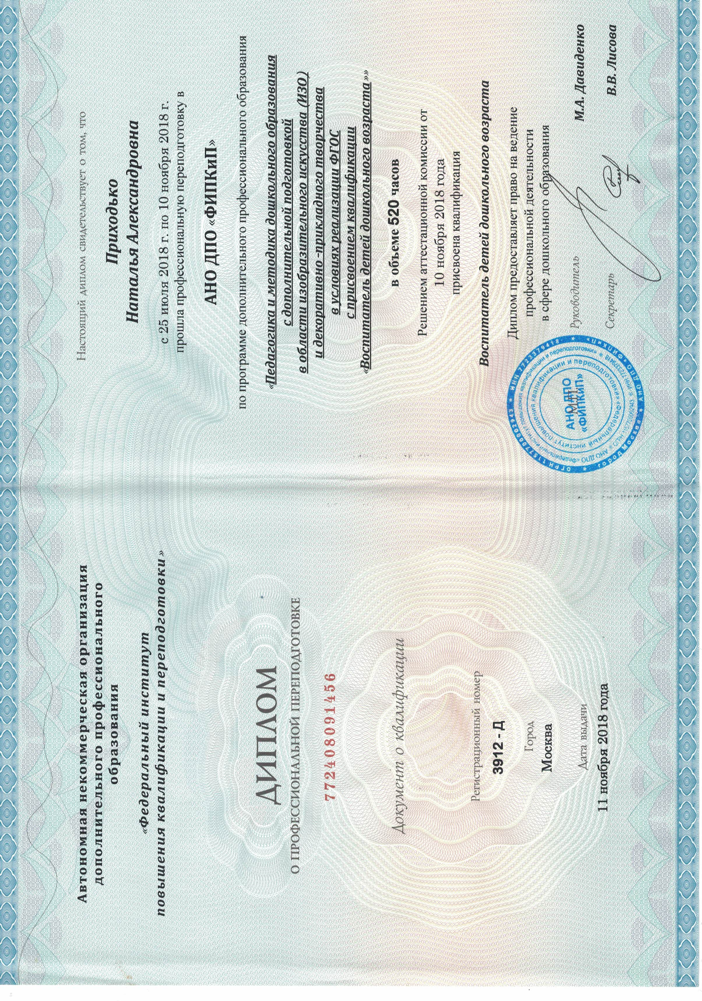 Образование по специальности: учитель математики, воспитатель детей дошкольного возраста. Присвоена квалификация: Учитель математики средних и старших классов, воспитатель детей дошкольного возраста. Документ о получении образования: скачать