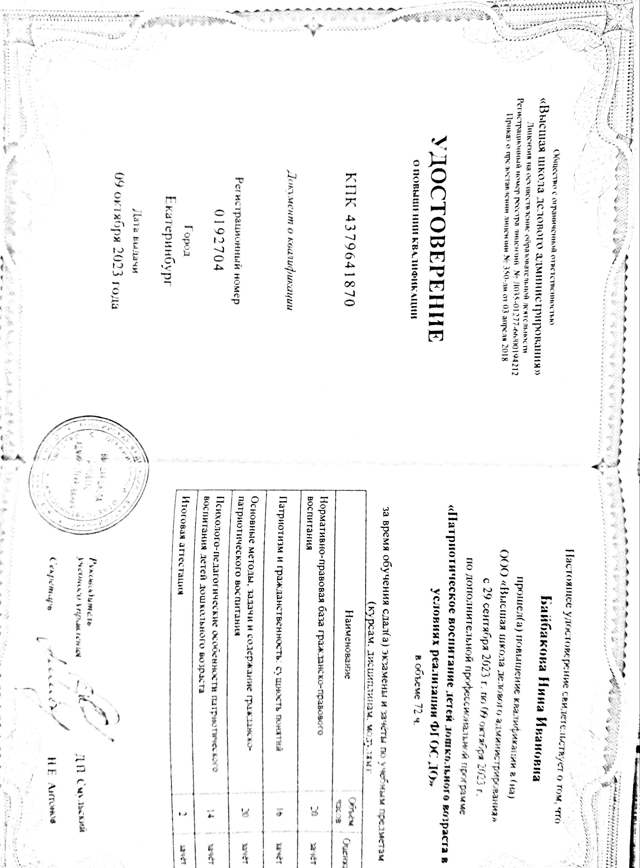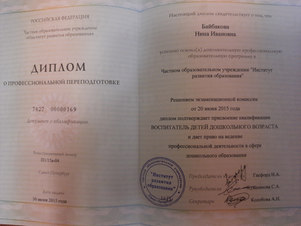Образование по специальности: Воспитатель детей дошкольного возраста. Присвоена квалификация: Воспитатель. Документ о получении образования: скачать