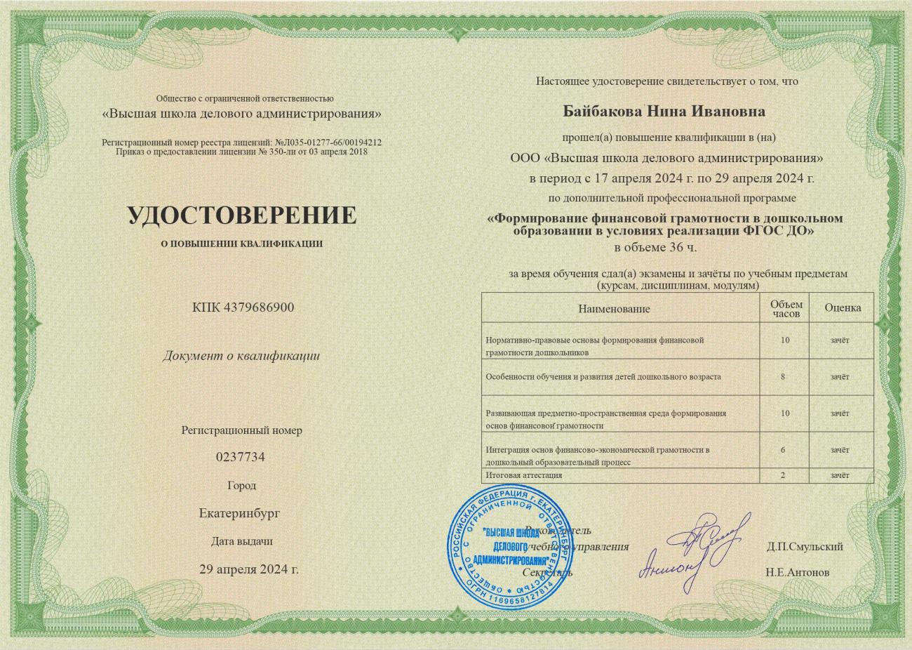 Обучение по курсу: Формирование финансовой грамотности в дошкольном образовании в условиях реализации ФГОС ДО. Документ о повышении квалификации: скачать