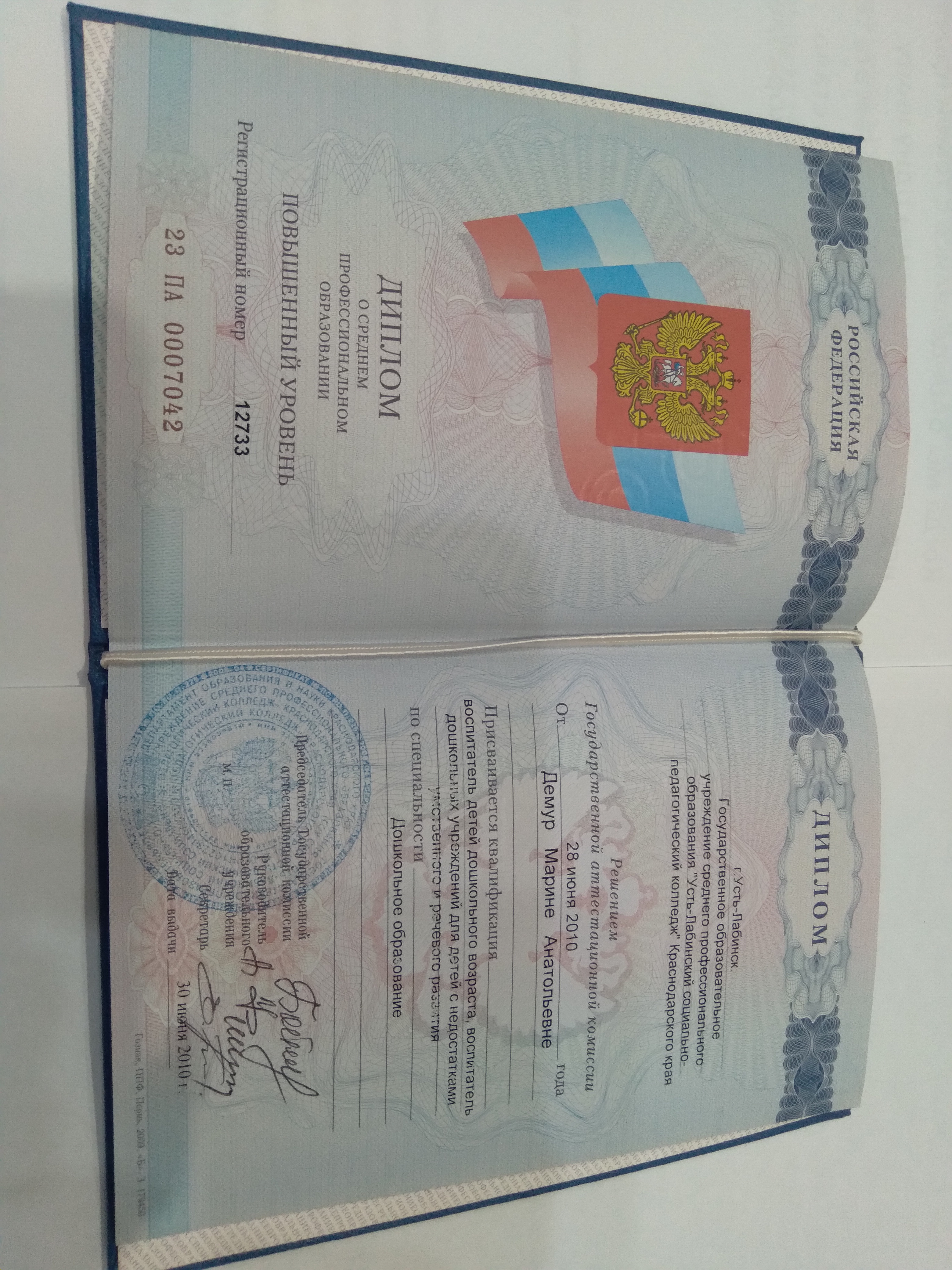Образование по специальности: Дошкольное образования. Присвоена квалификация: Воспитатель детей дошкольного возраста, воспитатель дошкольных учреждений для детей с недостатками умственного и речевого развития. Документ о получении образования: скачать