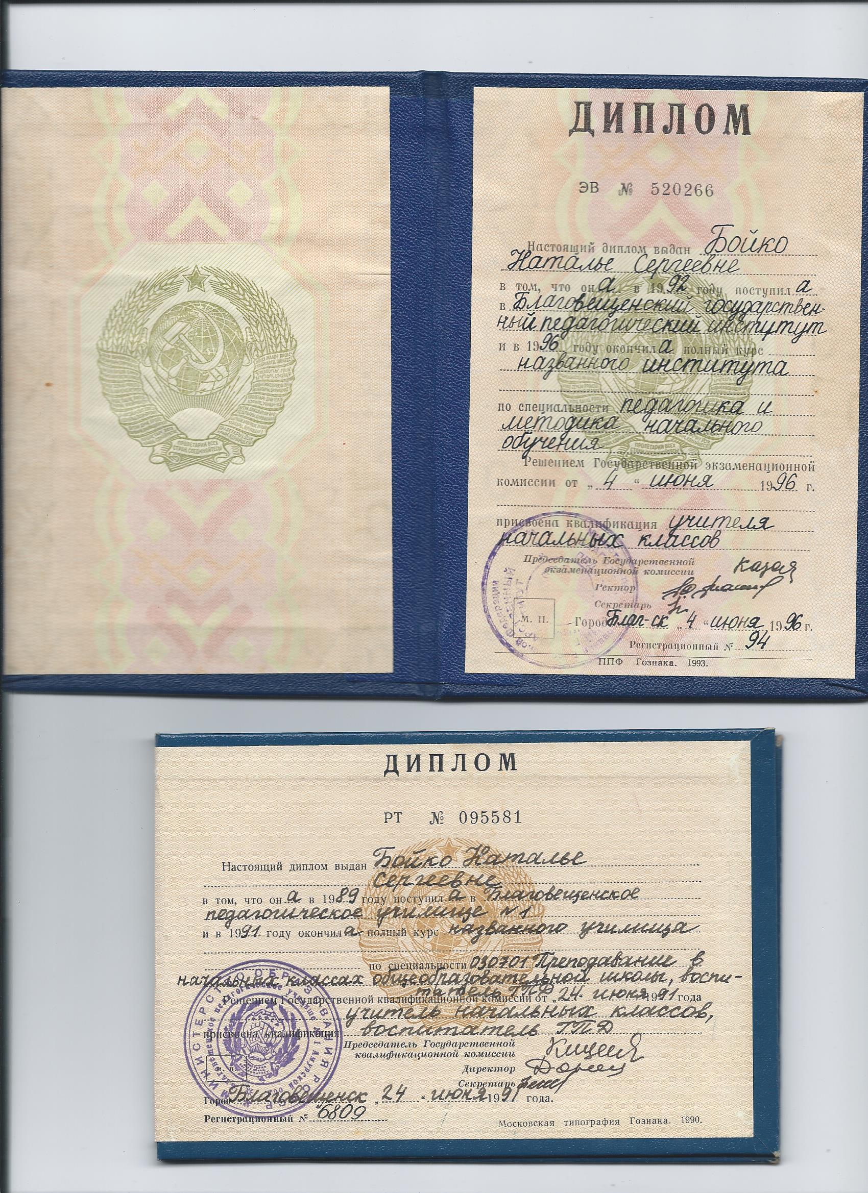 Образование по специальности: педагогика и методика начального обучения. Присвоена квалификация: учитель начальных классов. Документ о получении образования: скачать