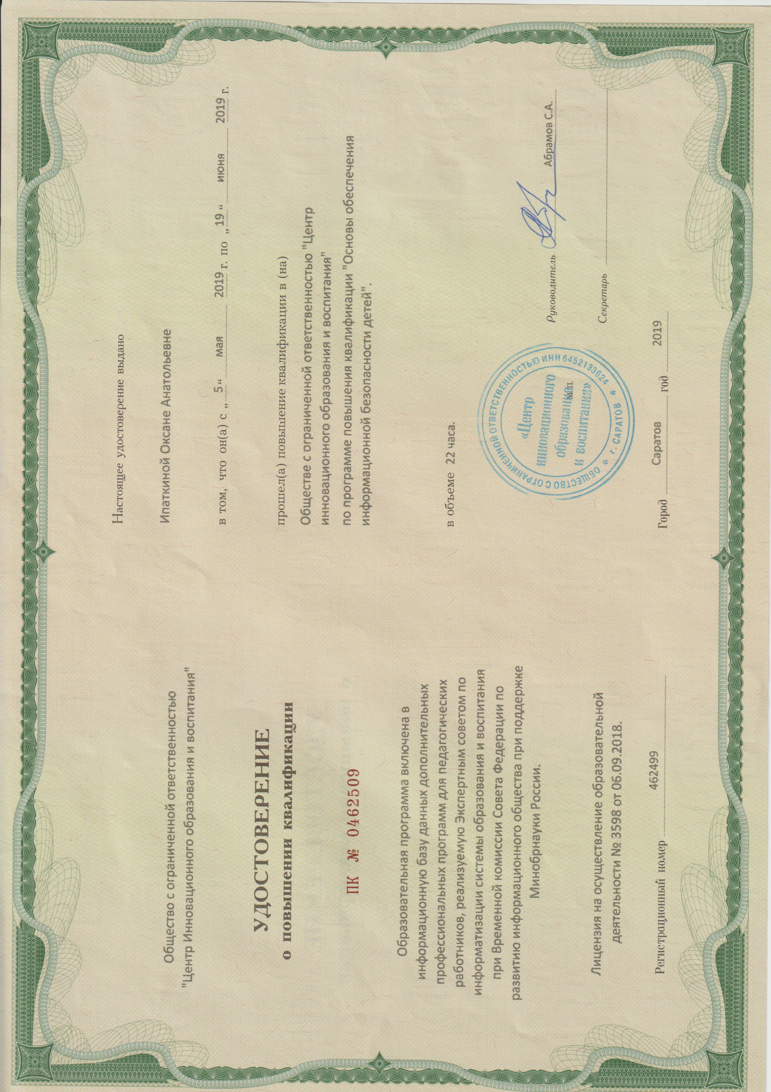 Обучение по курсу: Основы обеспечения информационной безопасности детей. Документ о повышении квалификации: скачать