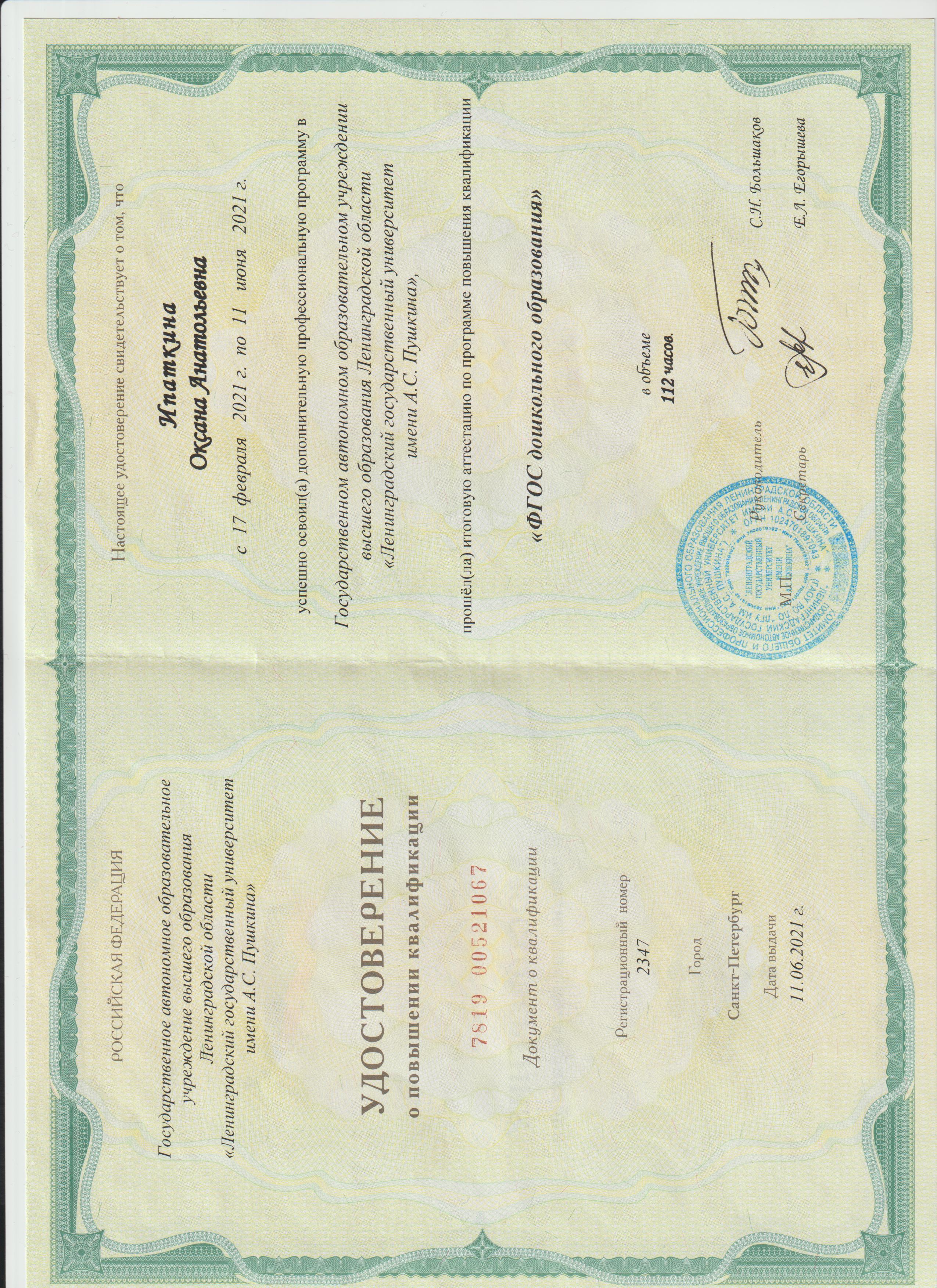 Образование по специальности: Дошкольное образование. Присвоена квалификация: Воспитатель детей дошкольного возраста. Документ о получении образования: скачать